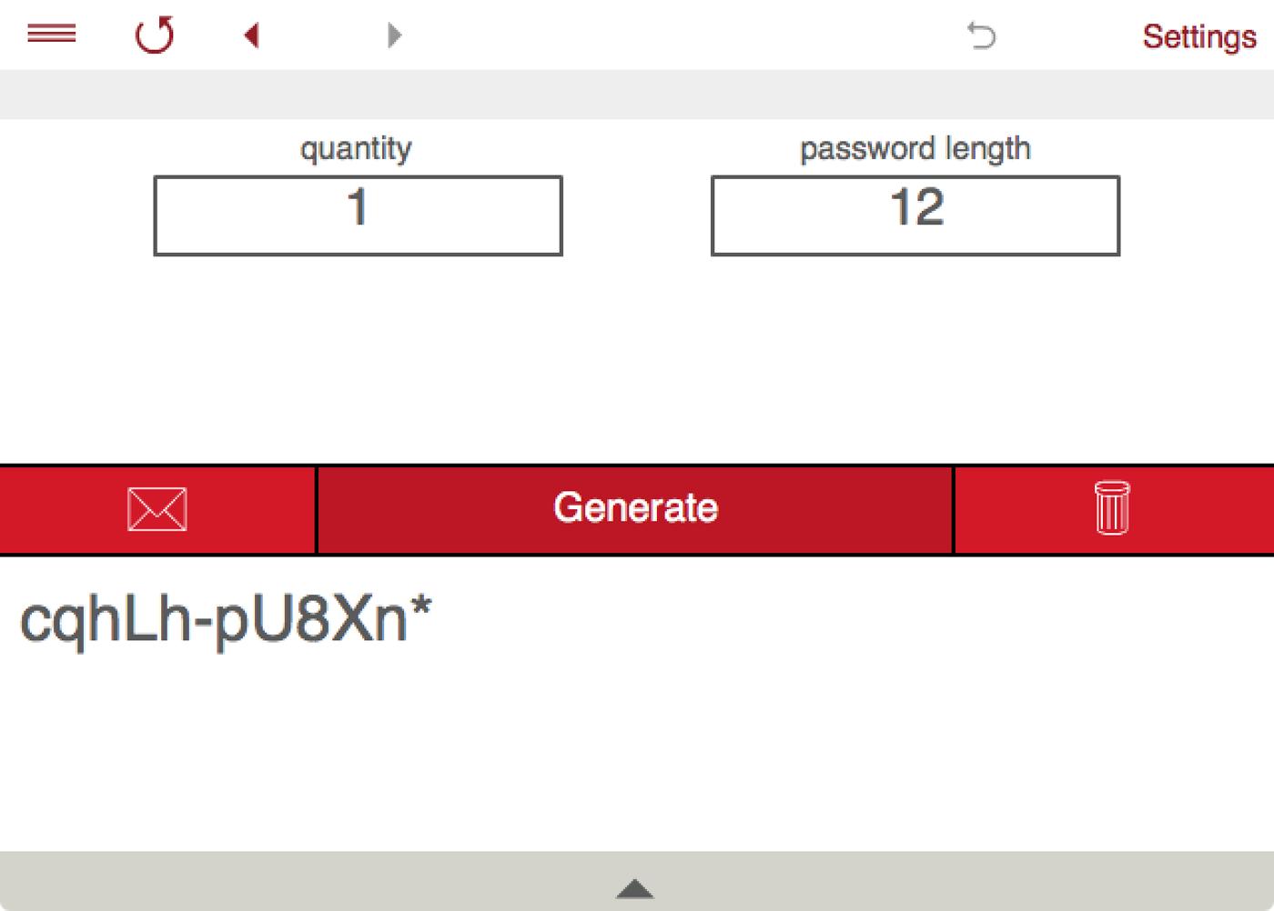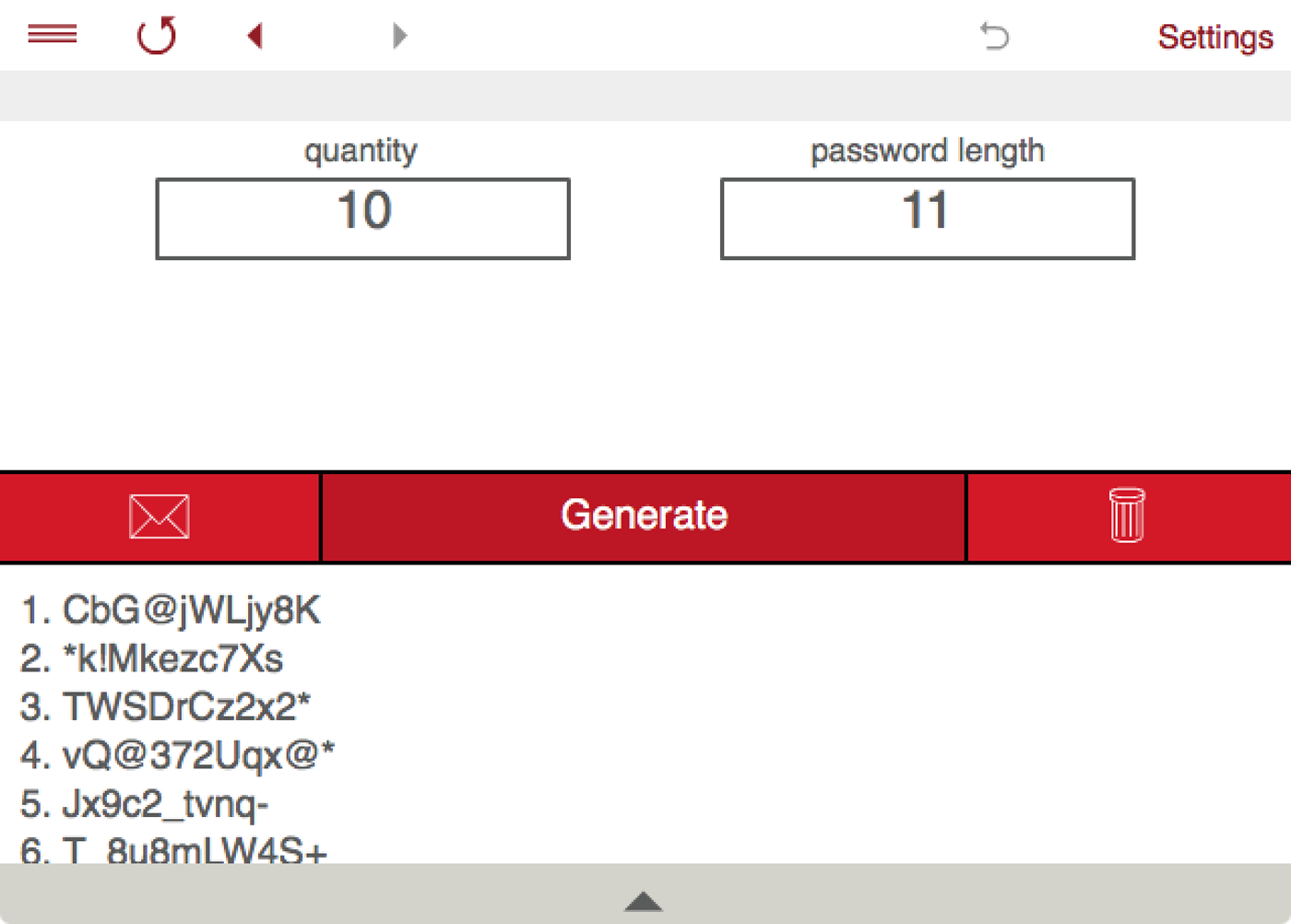 To generate passwords set the password length (up to 100 characters), number of passwords, configure options for the types of characters you want to include and tap Generate.
