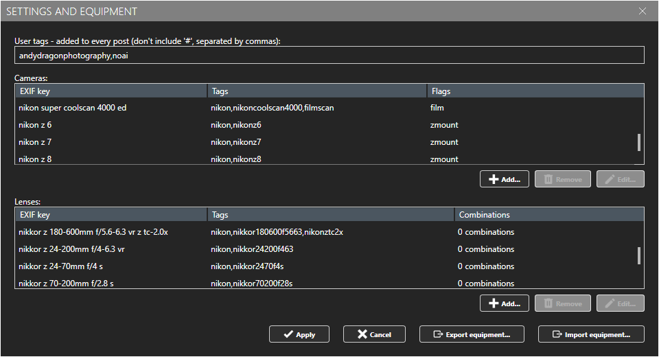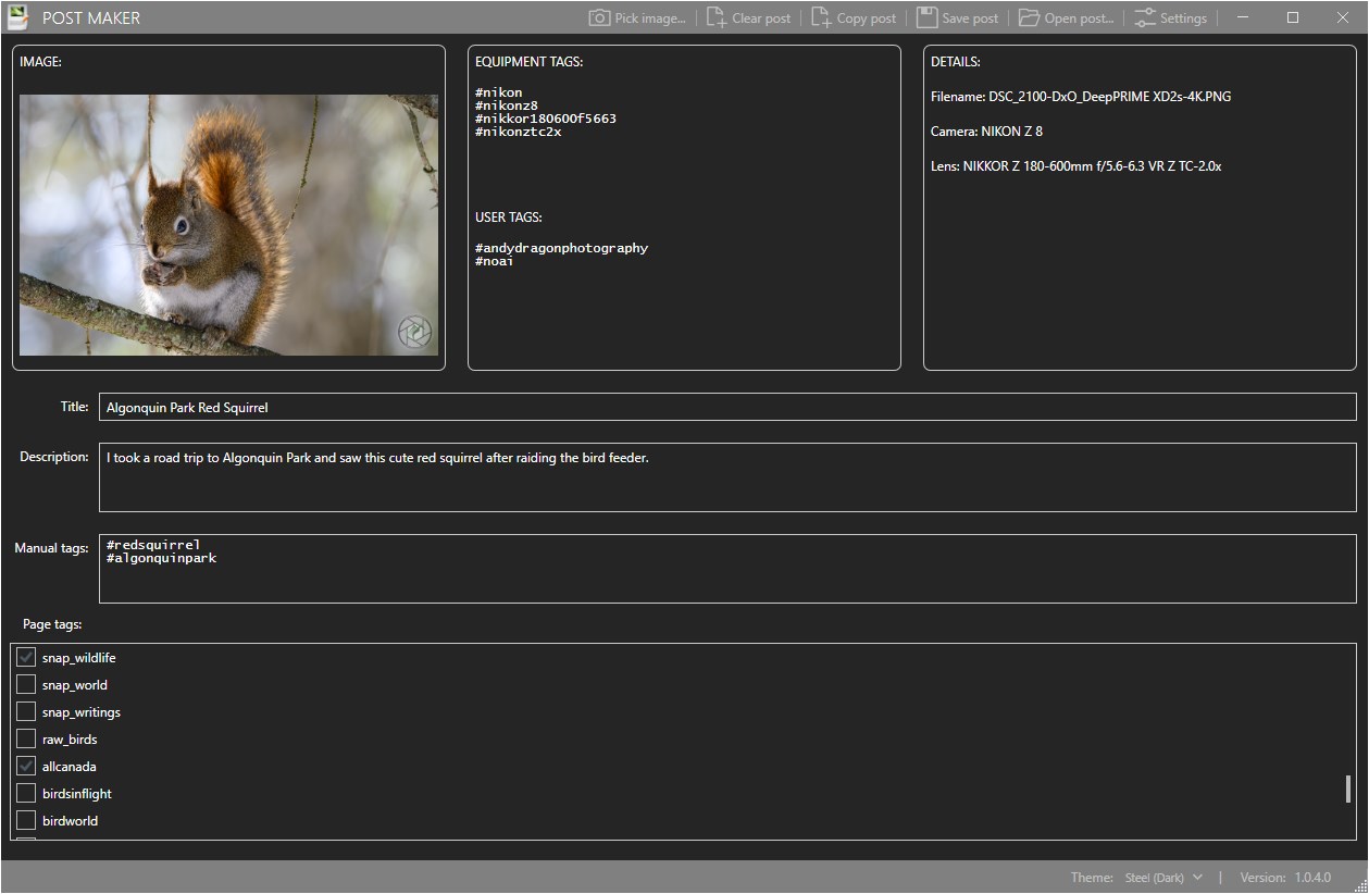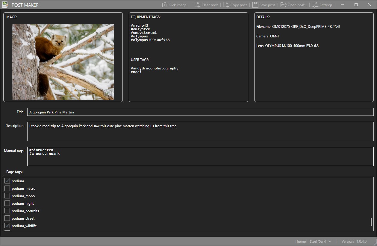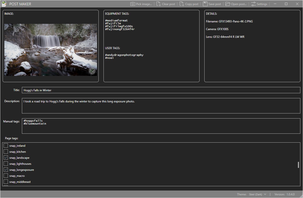 Post maker desktop app to aid in creating post text for a photo post on VERO using EXIF data, user entered description and allows picking from a list of pages for hashtags.