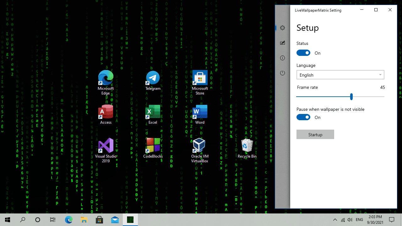 Live wallpaper for your desktop displaying the movement of letters, numbers and other symbols in the style of the film 'The Matrix' with sound and mouse support