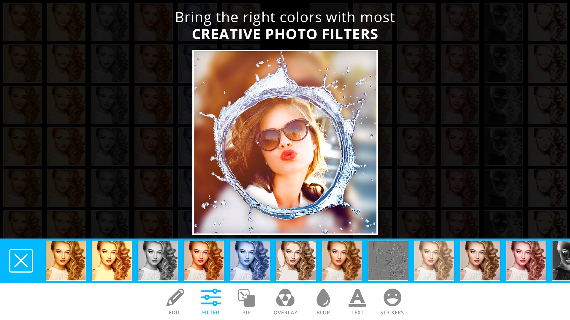 Except taking photos and making photo collages, PIP Camera is also a powerful photo retouching app. Built-in professional photo/ picture retouching function, mysterious filters, fun sticker sets, text adding, photo/ picture editing, mosaic, professional editing and so on.