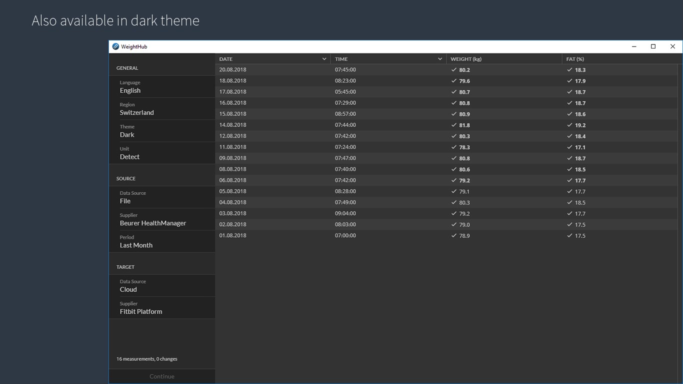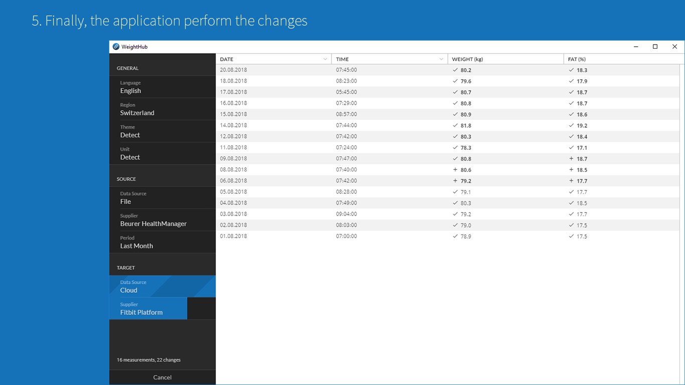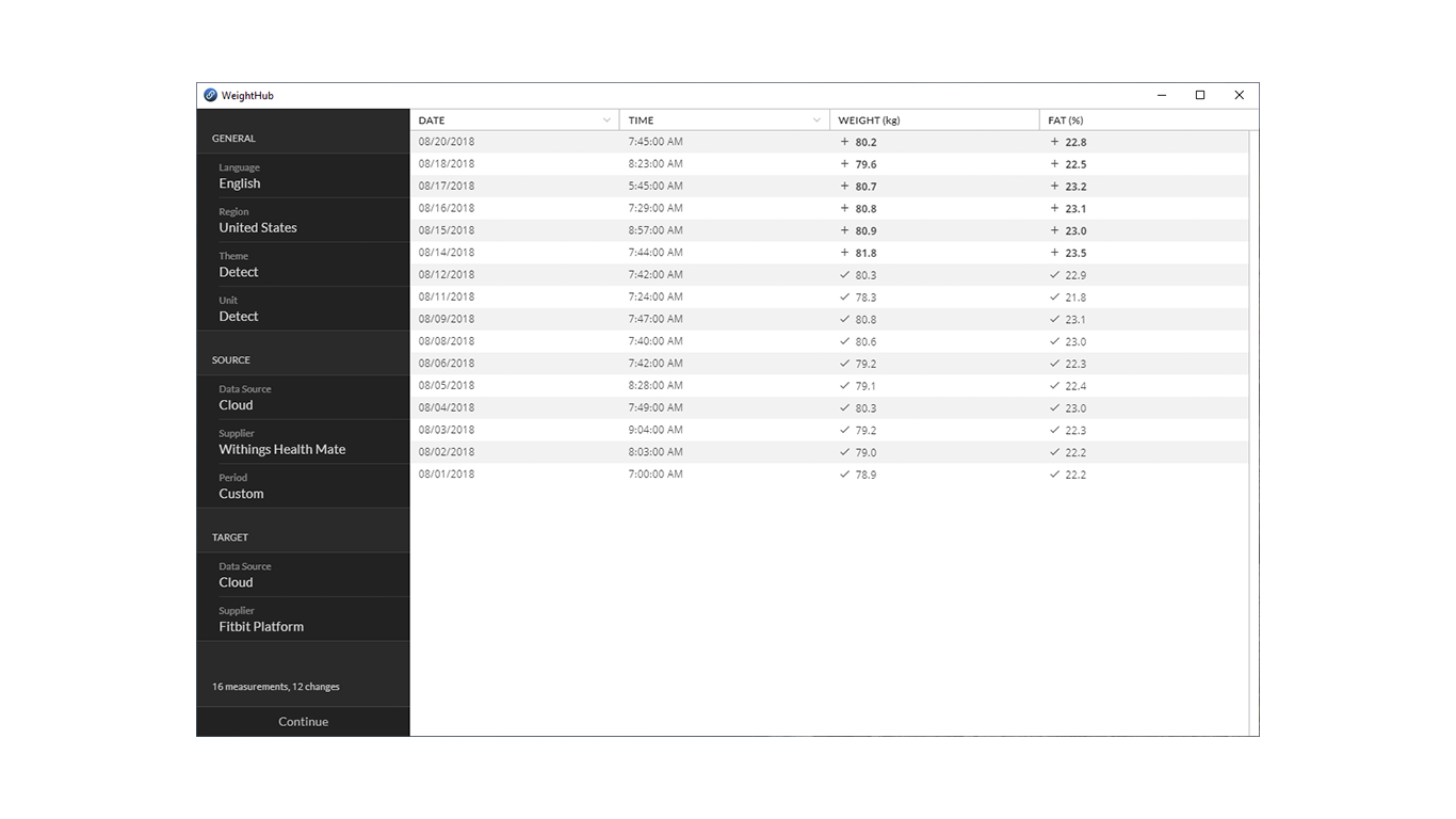 Weemple WeightHub is an easy-to-use desktop app, to seamlessly synchronize your body weight data between platforms, with clouds or files.