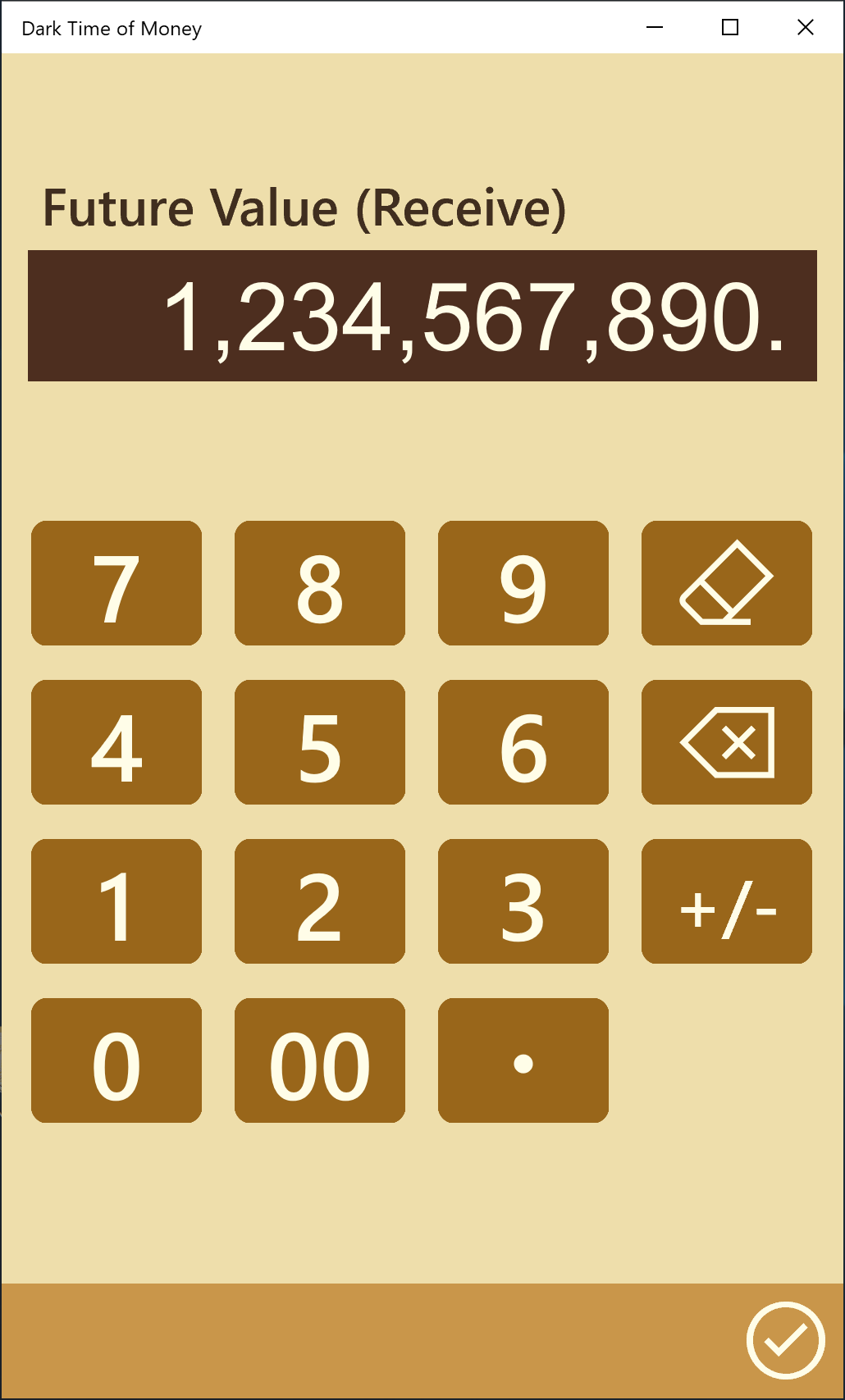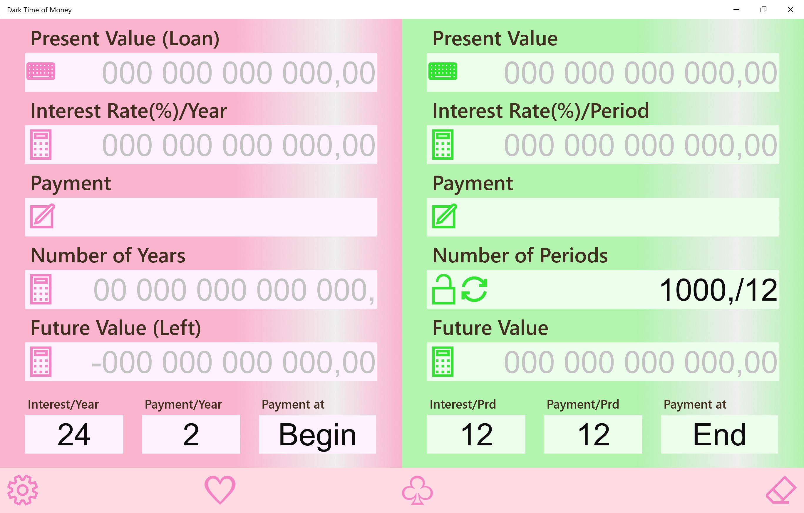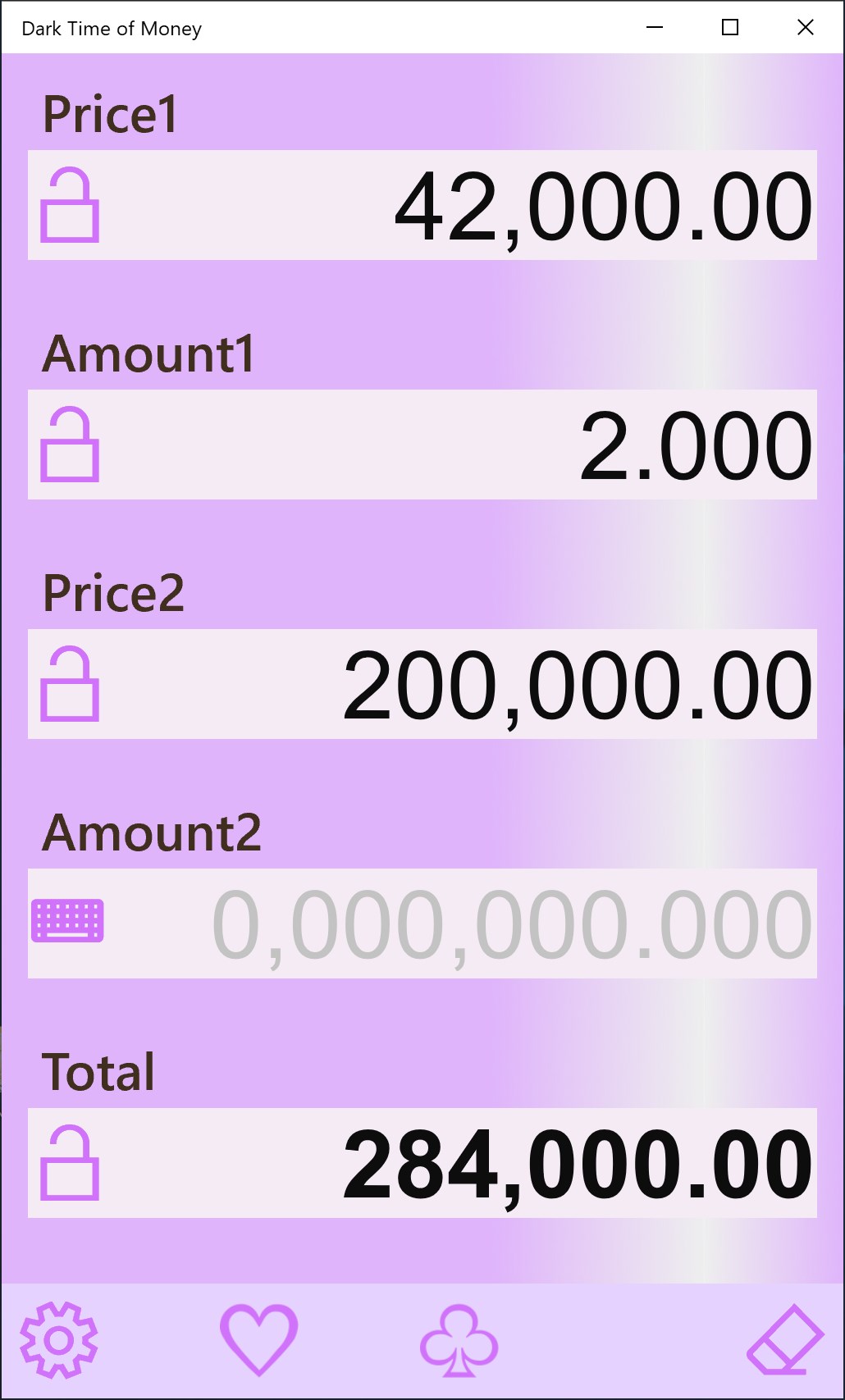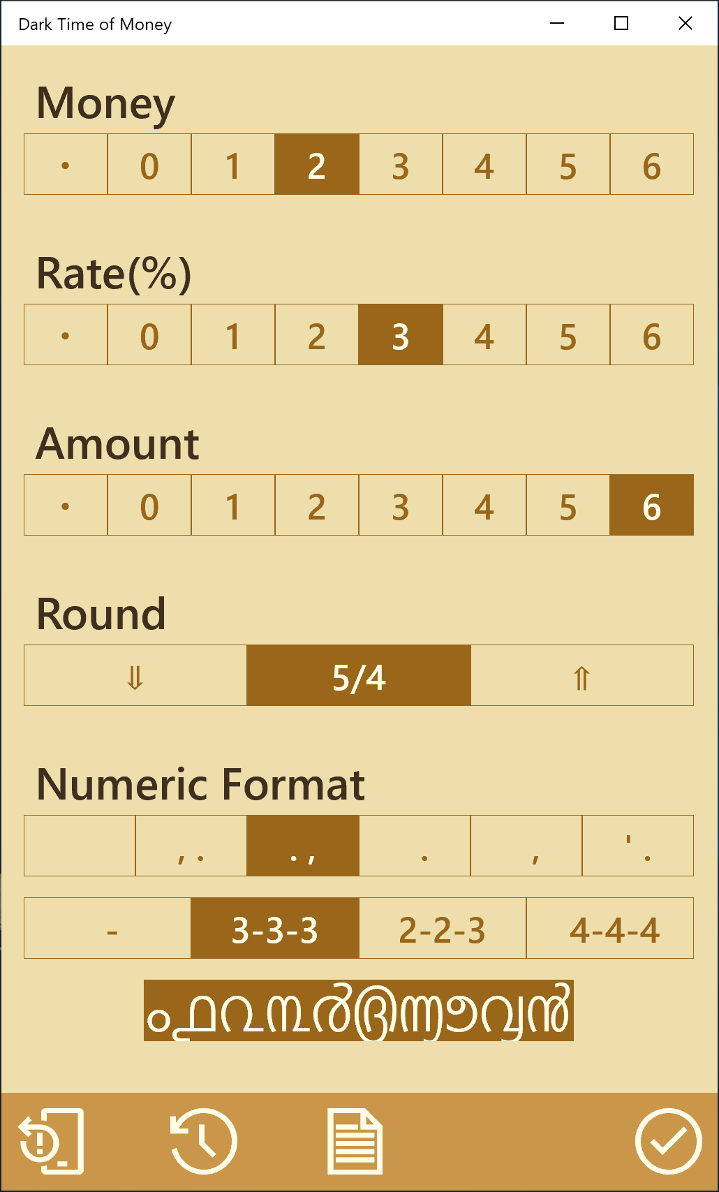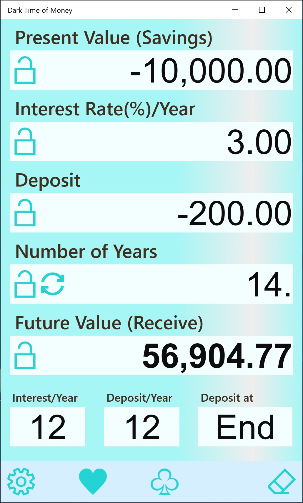 Compound and Simple interest calculation 3 sheets. Color-coded for your memorize help.Interest calculation sheet labels are selectable from 8 types.Simple total sheet (2 items total) and percent sheet are equipped as auxiliary.Number input and modification by direct touch action to the digit you want to change. In re-calculation of slight changes, entering full number is not necessary.Number input in keyboard sheet. And number input by hardware keyboard is possible.The direction of calculation is switchable by touch. Inverse calculation, changing result field to input, is easy.Calculation result is automatically done at the time necessary inputs reach.Lock of each number is possible.Internal calculation: 16-digit decimal or fraction independently developed (Not binary floating/double)Display number length is selected from 10/14-digit depending on window size.2 sheets can be parallelly shown and operated when window size is larger.Copy / paste function of a each number and a sheet.2 memoriesConfigurable rounding location classified 3 kinds, money/rate/amount.Selectable decimal point/separator character(5) and separator position(4), and number character(19).Automatic save of the calculation state at the application termination.Whole initializing. Or returning to the state at the time application started.Dark mode