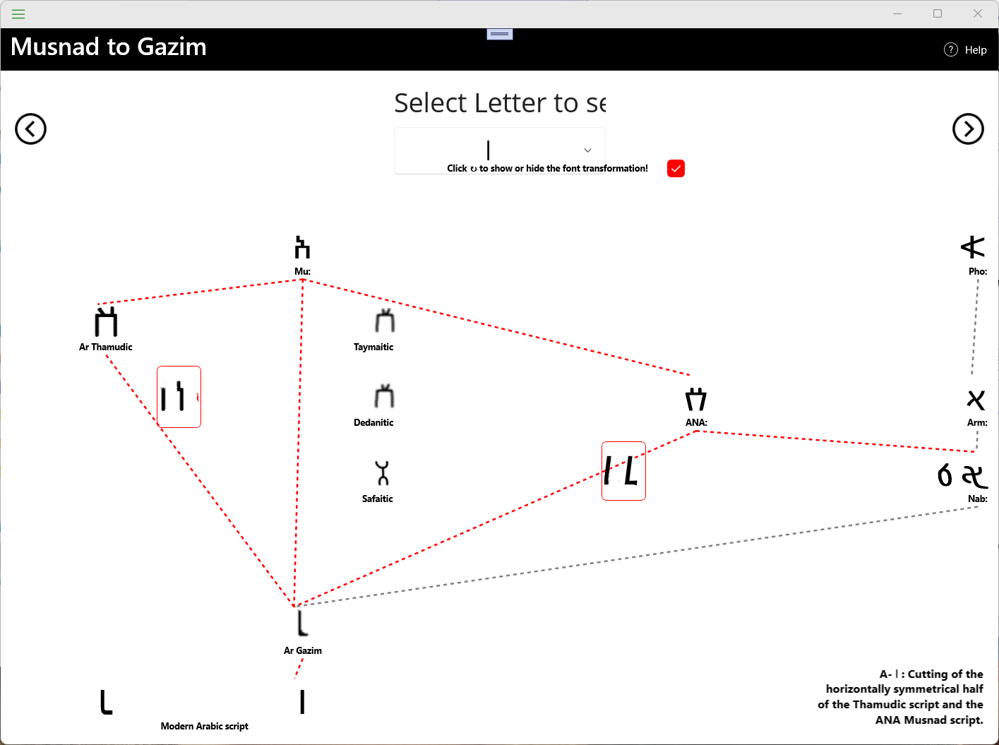 - Presenting an idea of the evolution of Jazm-letters, letter by letter, with information about the Nabataian letter on the one hand and the various Musnadic letters (especially the ONA and Thamudic) on the other hand.