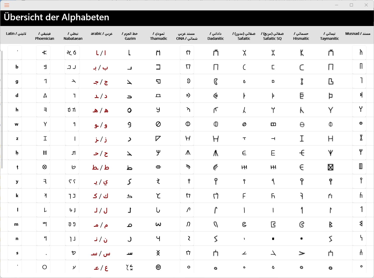 - A comparative table for some ancient Arab alphabets (ASA, ANA, Thamudic, etc.), as well as the alphabet of the Nabataian Arabs branching from Aramaic and Phoenician.