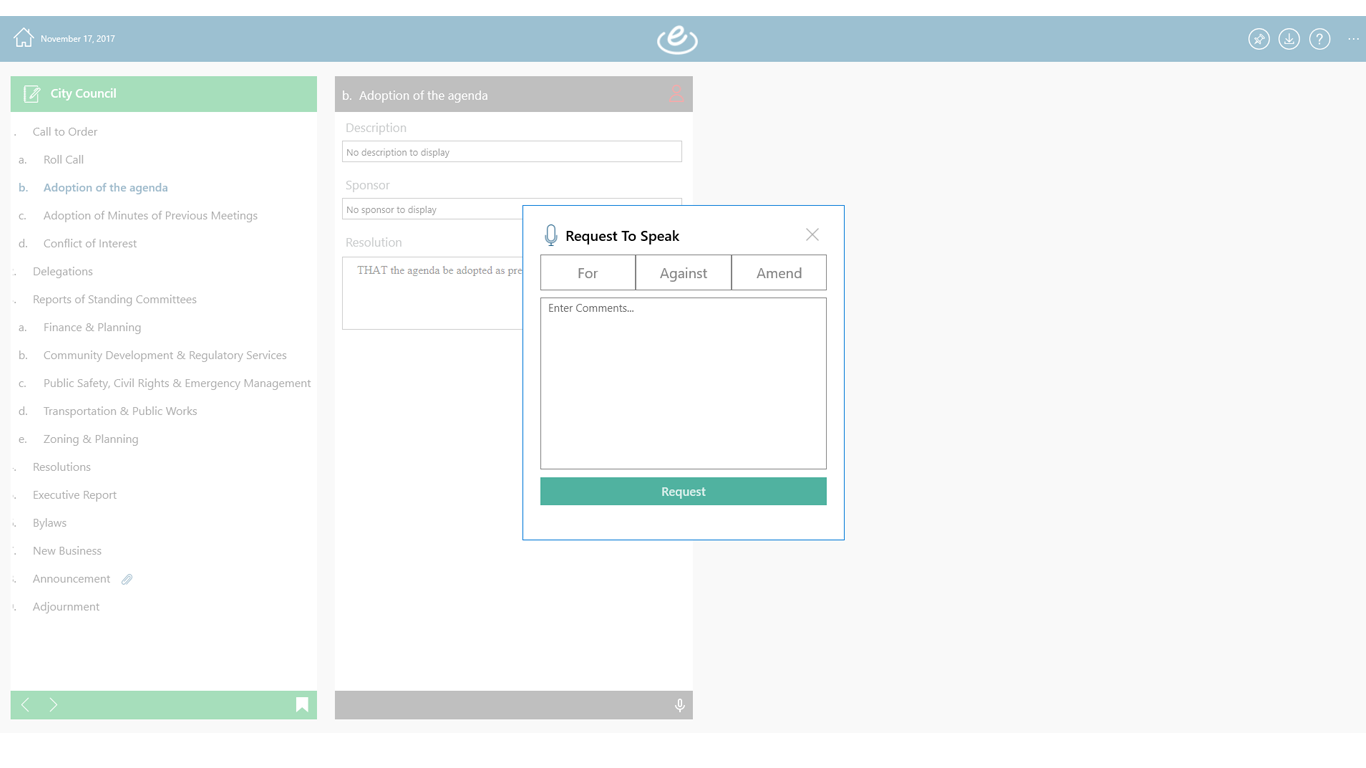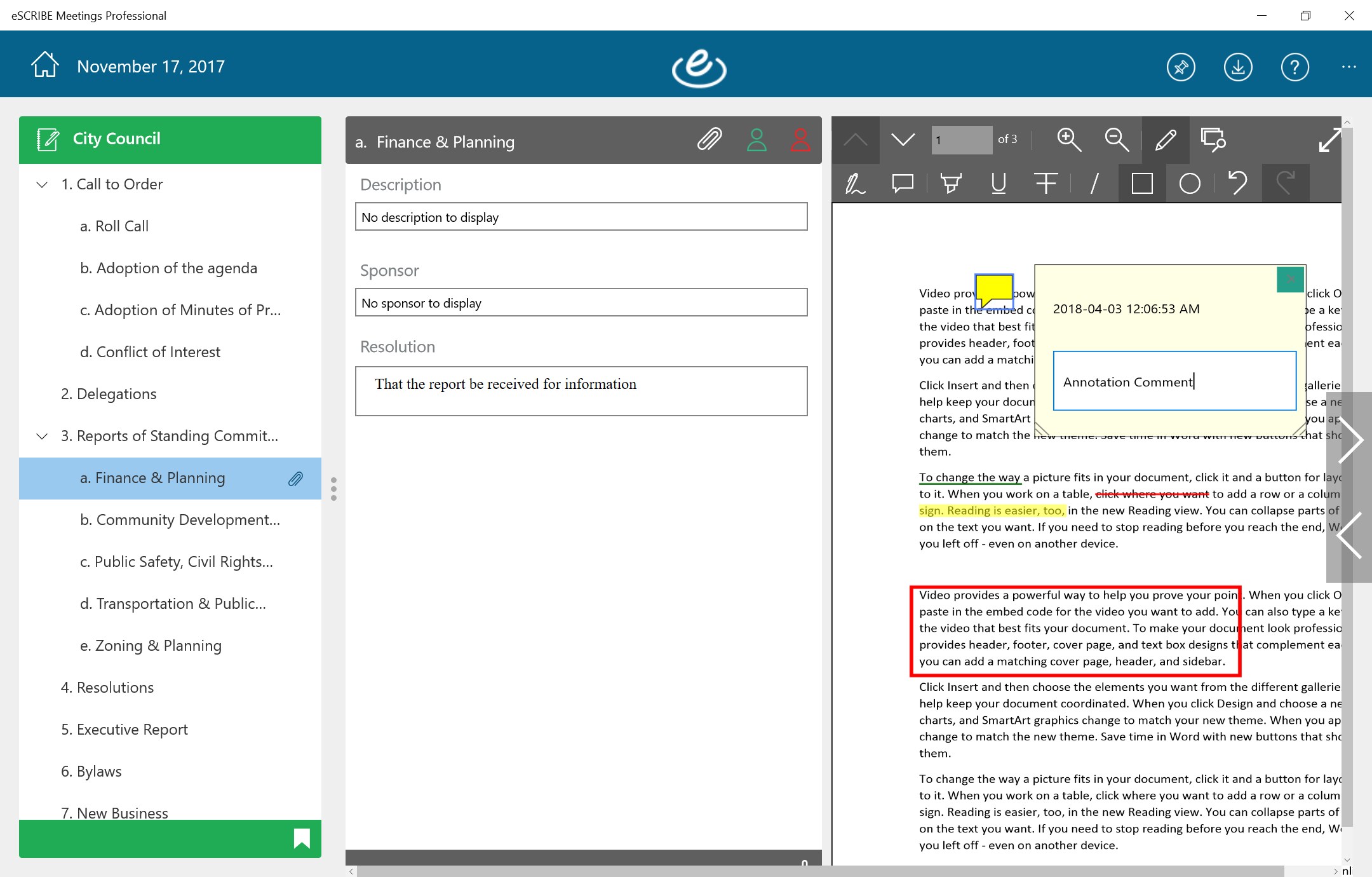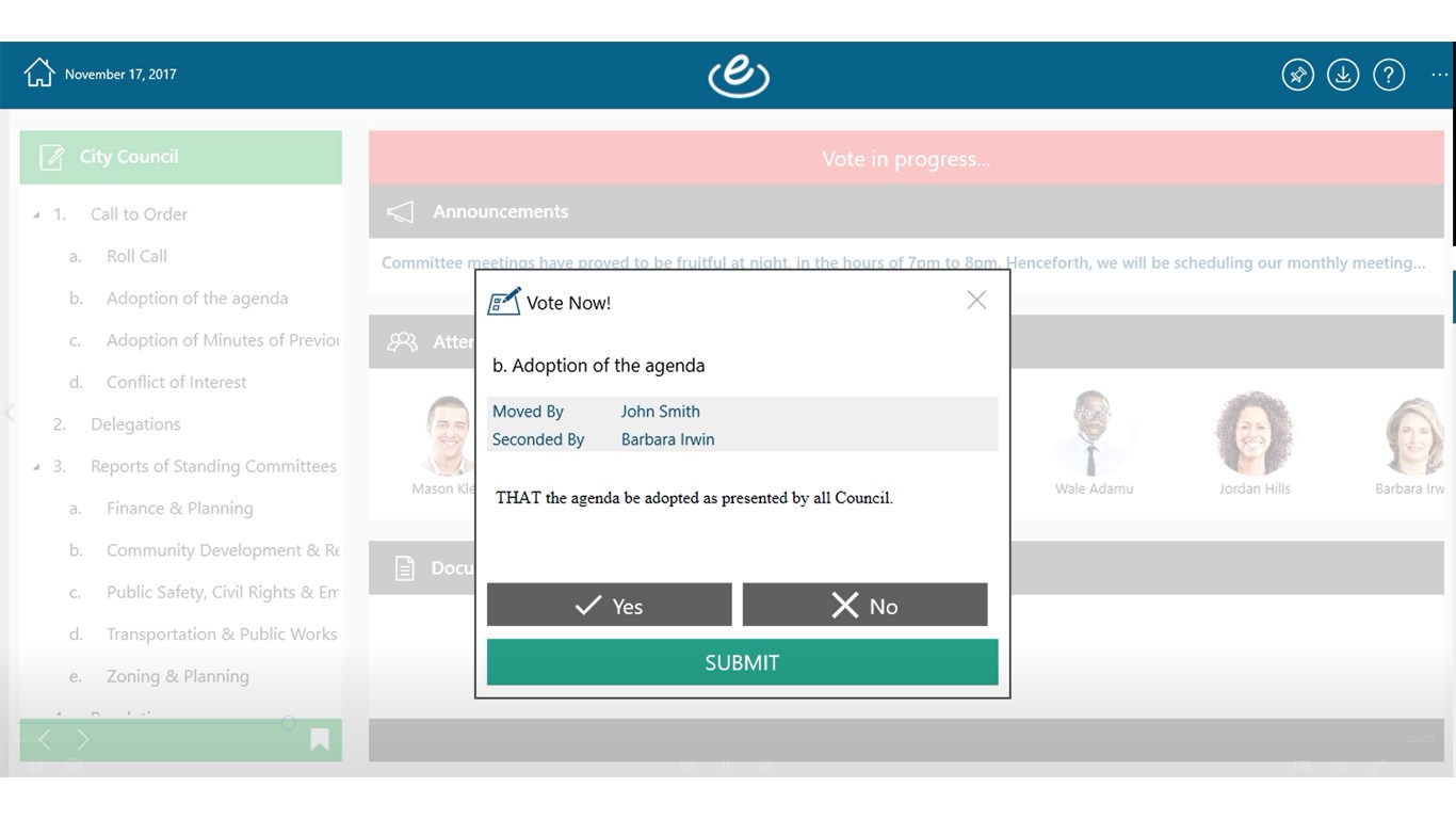 With eSCRIBE Meetings, users can securely sync with all authorized meeting portals, access detailed information, participate live in meetings, request to speak, declare conflicts, vote, annotate attachments and group chat based on their specific attendee role and security access level. Browse upcoming meetings, easily access agendas, draft resolutions, and all supporting information.