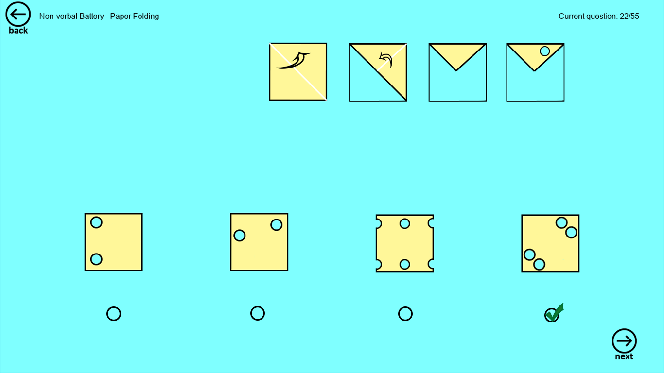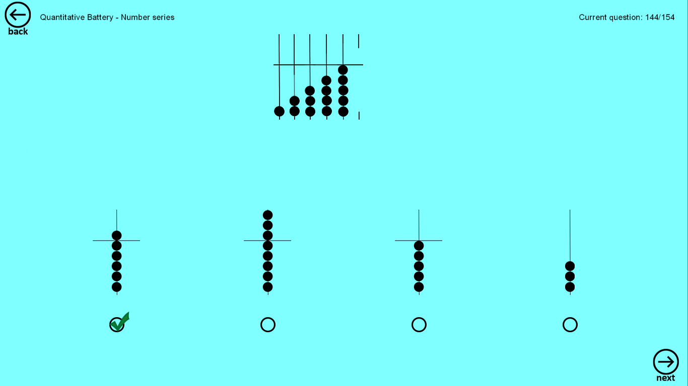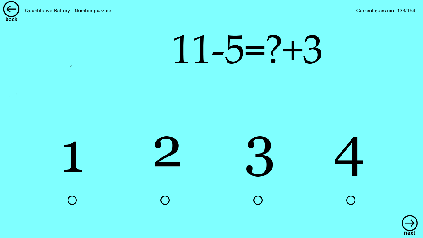 App provides test mode with 55 questions (quick test), and regular test with 154 questions. When you complete regular test, your scores will be recorded and you can see the history of results and observe trends.