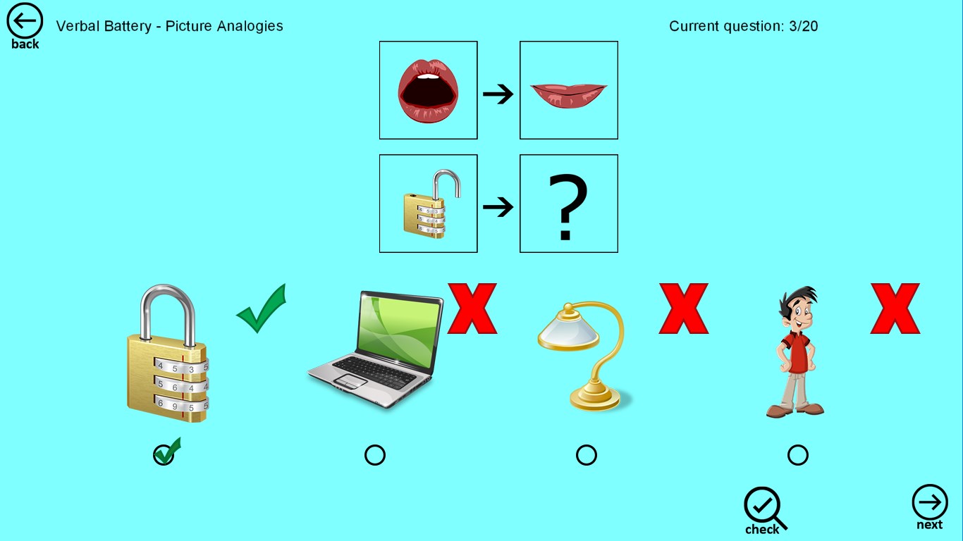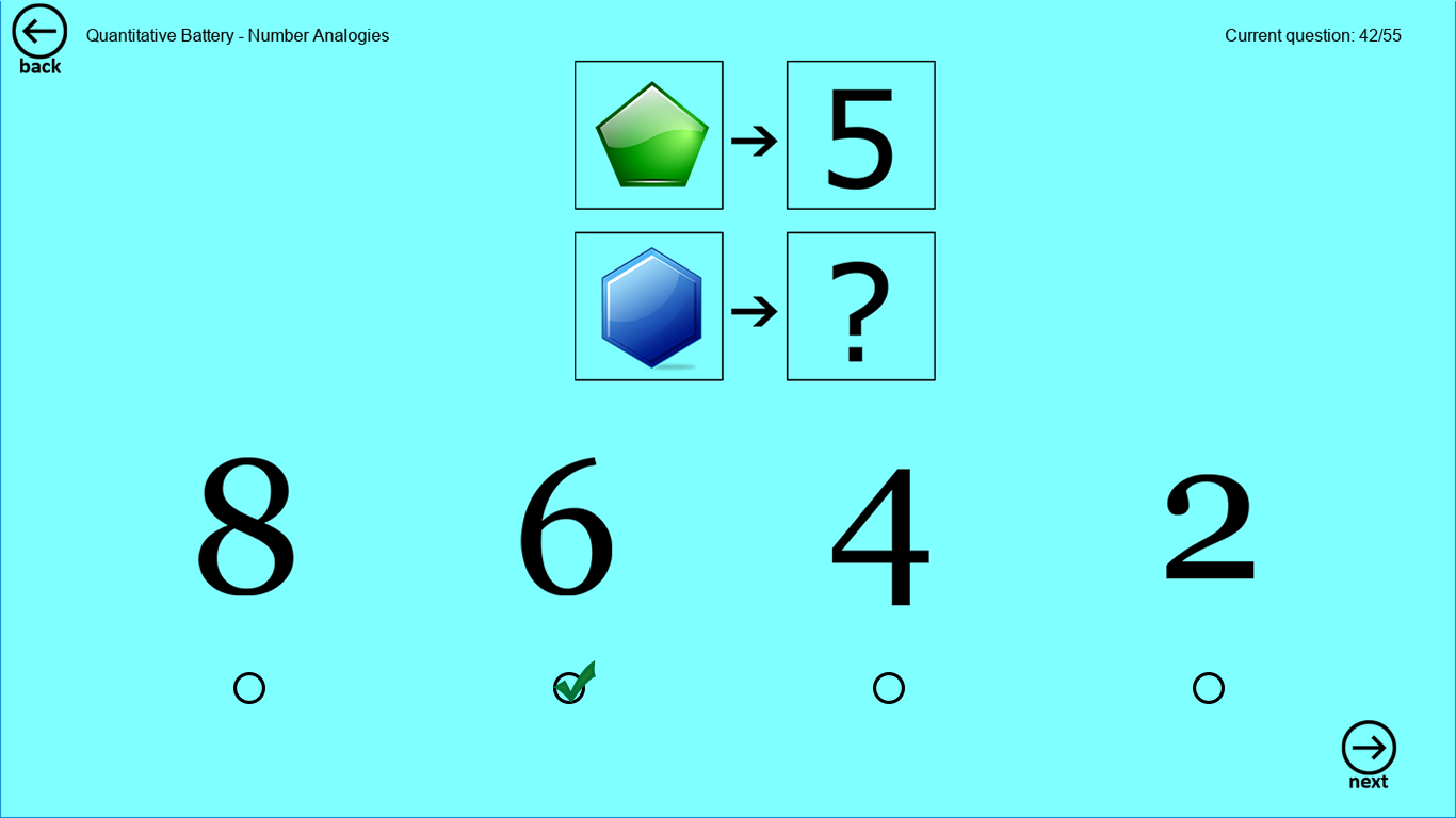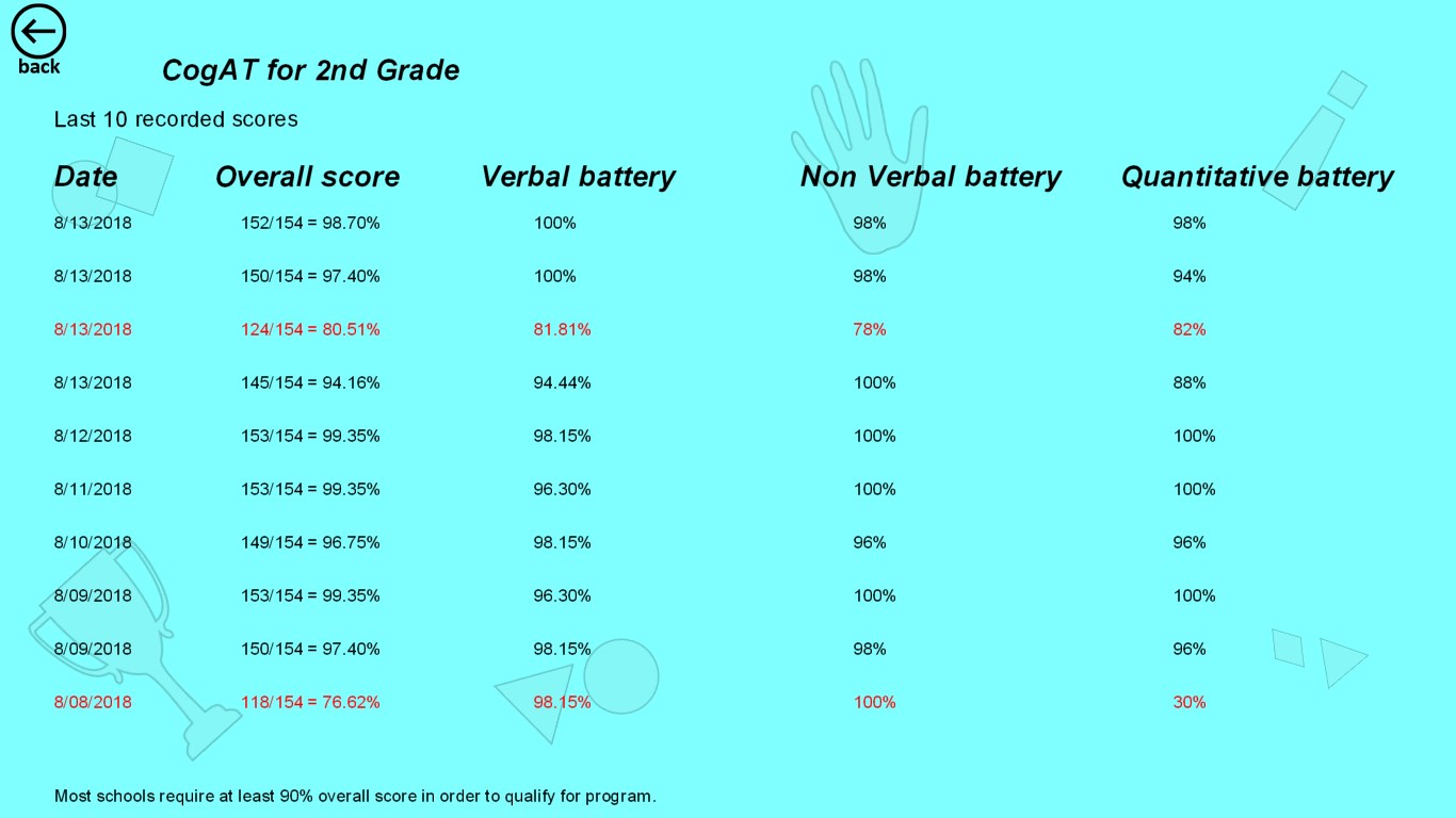 App provides test mode with 55 questions (quick test), and regular test with 154 questions. When you complete regular test, your scores will be recorded and you can see the history of results and observe trends.