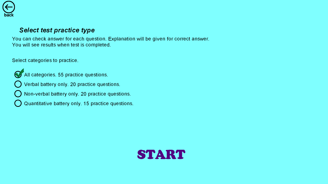 App provides you with practice mode where you can check for correct answers while you are taking the test, and you can select to focus on specific areas for practice.