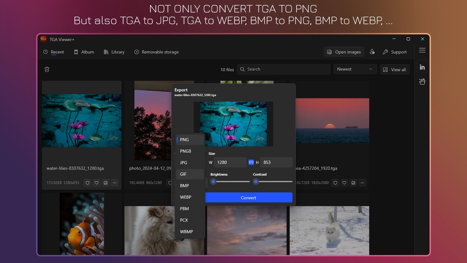 View TGA, ICB, VDA, VST and popular image formats.Convert TGA, ICB, VDA, VST and popular image formats to PNG, JPG, BMP.