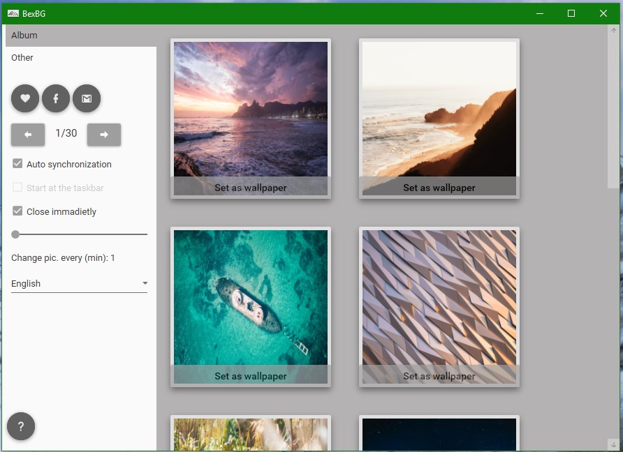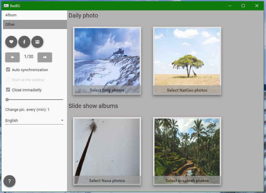 The app sets backgrounds from the websites like Bing, or National Geographic, so it is always new. The program starts up with windows so you always find another wallpaper on your screen. And if you want to fix wallpaper you can find your favorite picture between album's photos. Slide shows are also available in this app. You can set easily slide show time and you can move to tray it. During the app's development our goal was to make it easy-to-use.
