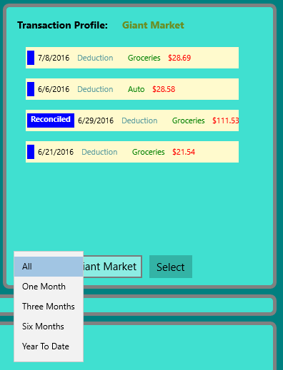 The Transaction Profile display allows display of all transactions for a selected Name. The list displayed can be further filtered for a particular time frame. This allows access to transaction previously entered for modification or deletion.