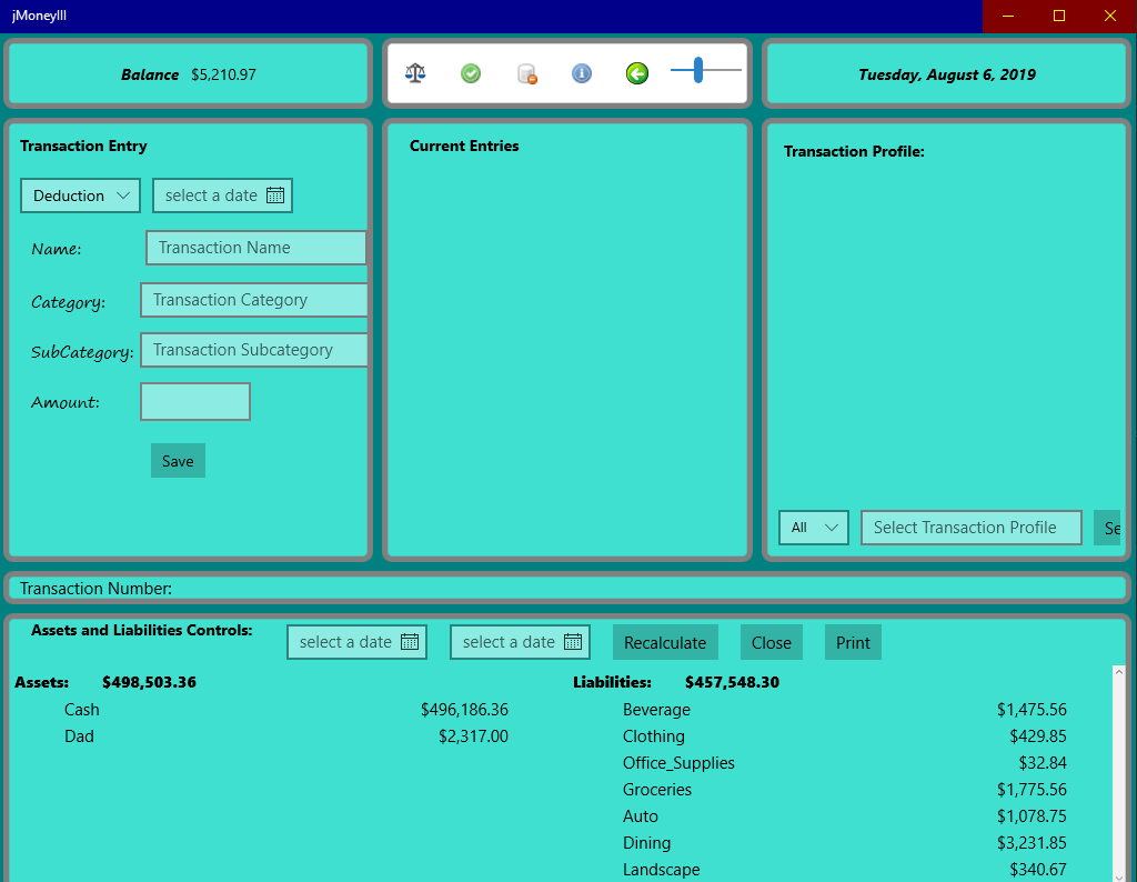 The user will be required to enter a directory for each transaction database maintained and can switch between databases by selecting to go back to the directory entry screen. Transactions can be entered as deductions or deposits or as a check entry. The application maintains the check number entered and automatically updates to the next number. Transactions entered are displayed in a current entry list and profile list showing all transactions associated with the current entry. Transactions can also be displayed in a ledger format. All displayed transaction formats can be individually selected and updated or deleted. Additionally, transactions can be shown as categorized Assets and Liabilities with totals. Note that downloading or updating this app on your PC will delete any previous jMoneyIII database files generated. Therefore it is recommended that the Transaction Database and SavedData Database files be archived regularly.