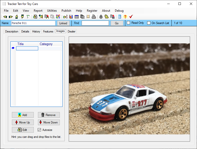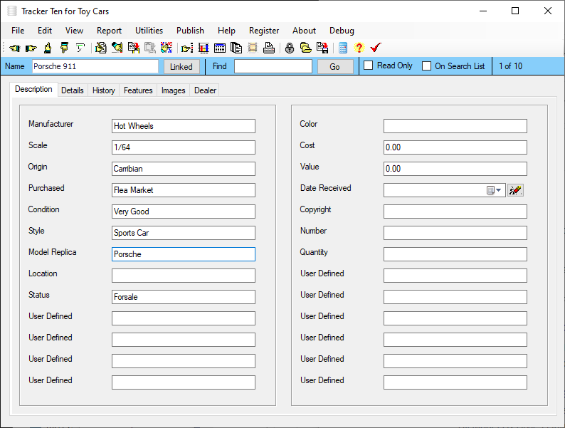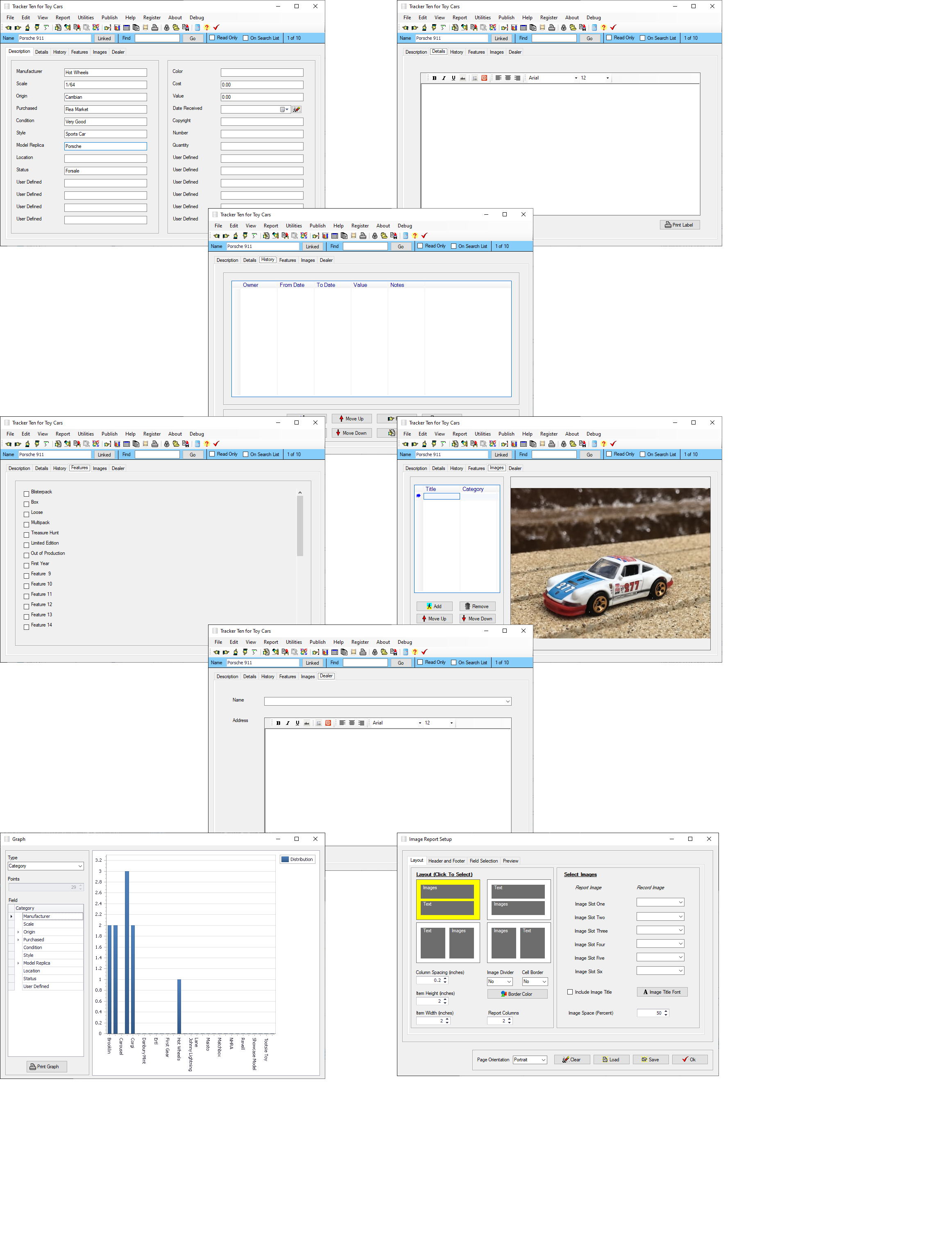 Tracker Ten for Toy Cars is a complete windows inventory system that will help you get you organized fast. The software features advanced reporting, graph generation, item history tracking, customizable data fields, rich text format notes, data export, a powerful search engine, cost and value tracking (based on values you enter yourself) and an innovative summary view integrated with internet searching. The software can also generate full color reports, incorporating images; great for accurate insurance record keeping and automatic catalog generation. The software is ideal for both business and personal use.