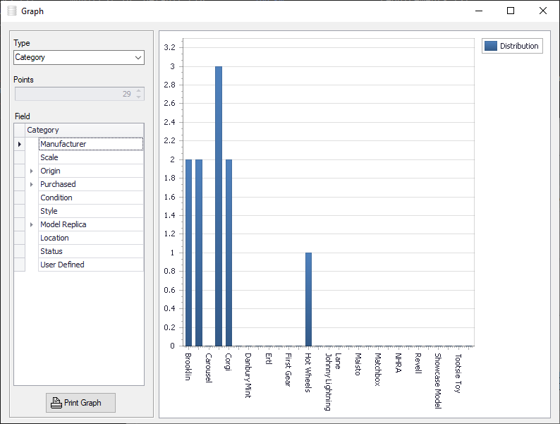 Very easy to learn and use. Online help file. Sample fields include manufacturer, scale, origin, purchased, condition, style, model replica, location, status, color, cost, value, date received, copyright, number, quantity and more!RTF notes area for each item.Grid area to track history.30 Customizable feature tracking checkboxes. Product supplier name and contact information tracking area.Advanced multi-level nested item categorization system. Quick and Easy Data Entry with Customizable Pull Down Menus. Powerful Data Sorting and Filtering. Simple and easy cut, copy, insert and record navigation functions.Multiple Image Support (up to 100 pictures for each record !). All major image types are supported (i.e. bmp, jpg, gif, png etc.).Easily incorporate pictures from your Digital Camera or Scanner. PDF documents also supported.Full color image reports.Hyperlink Storage for each item. Cost and value tracking (based on data that you enter yourself). Powerful and Intuitive Search Functions that let you quickly and easily retrieve the data you need Comma delimited data import. Multiple Data Views Including Spreadsheet, Album View (allowing you to visually view different items in your inventory side by side) and 3-dimensional full color Graphs showing inventory breakdown. Data export features allowing you to transfer data to spreadsheets or other software programs. Data export features allowing you to transfer data to spreadsheets or other software programs.
