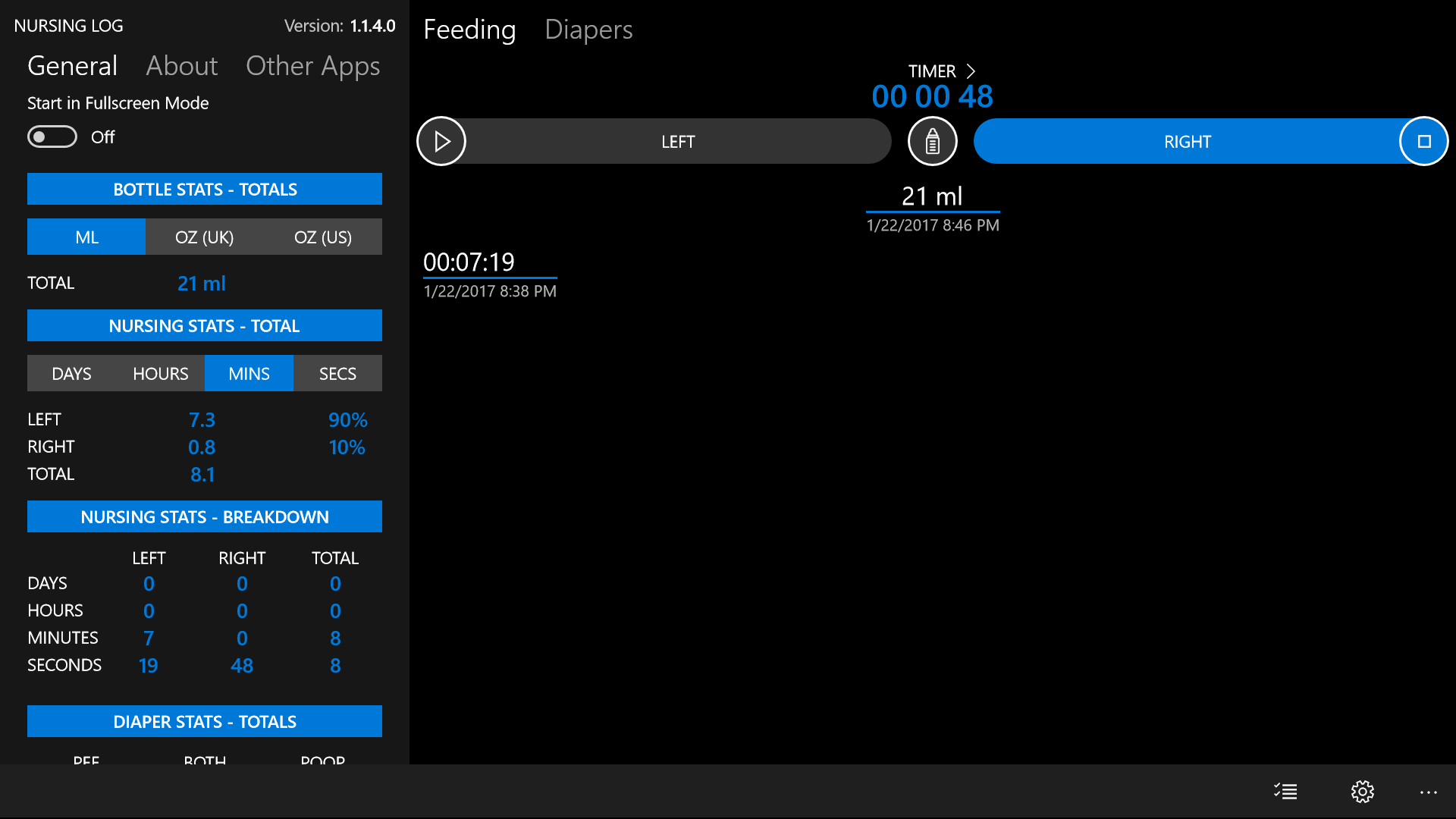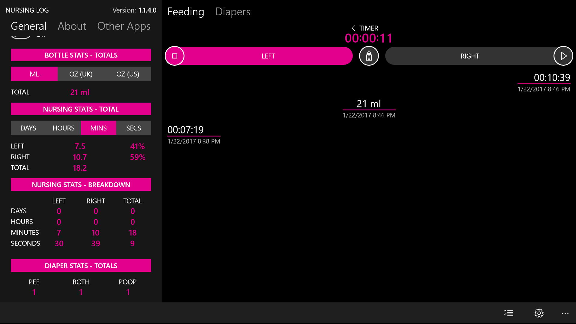 Nursing Log is an app to help track which side you last used to feed your baby or pump for later. You can also track how much your child drinks from a bottle and how many times your child has dirtied their diaper.