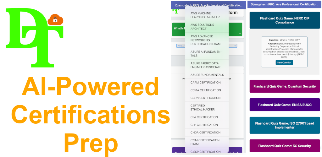 Master your professional certification exams with ease using Djamgatech, a powerful and intuitive study app designed for aspiring professionals. Whether you're targeting certifications in Cloud Computing, Cybersecurity, Finance, Healthcare, Project Management, Artificial Intelligence, Data Science, Networking, or Infrastructure, Djamgatech equips you with the essential tools needed to succeed.