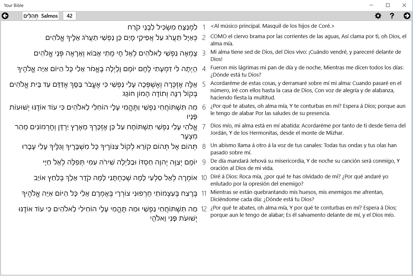 Includes original Jewish Bible (Hebrew with diacritics) and translations to English, Spanish, French, German, Russian, Chinese Simplified.