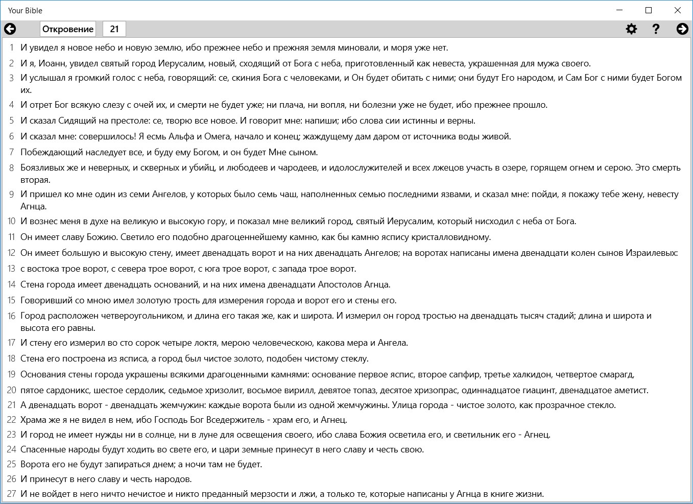 Read Bible (Old and New Testament) using easy book and chapter navigation and setting convenient for you letter size and line space.