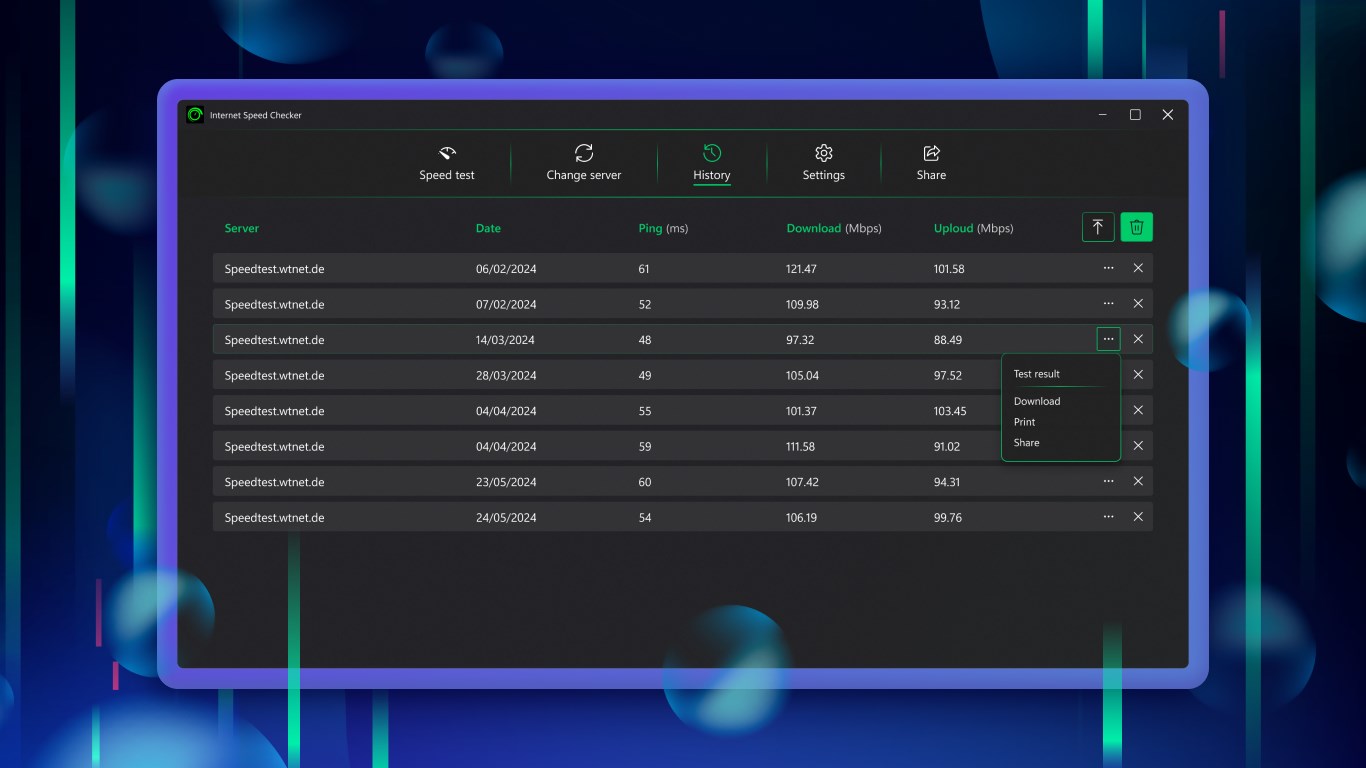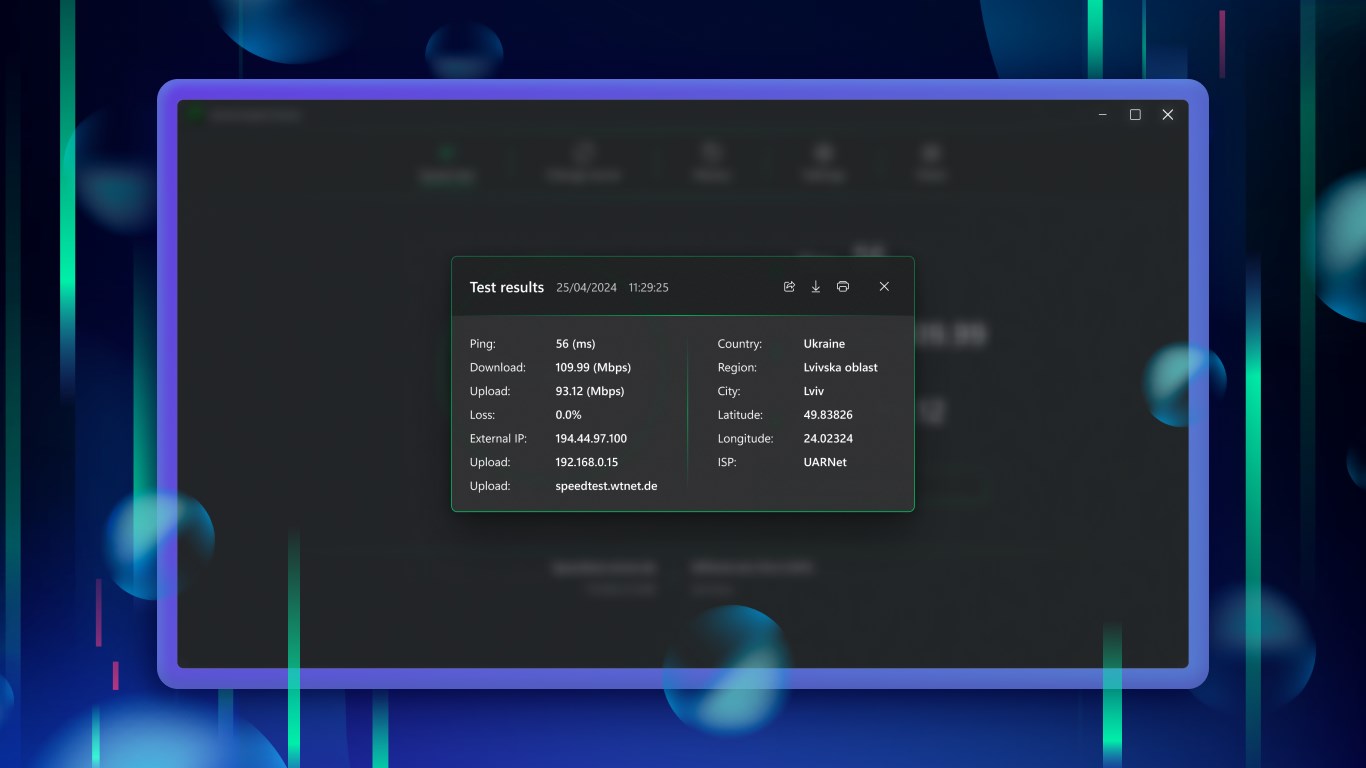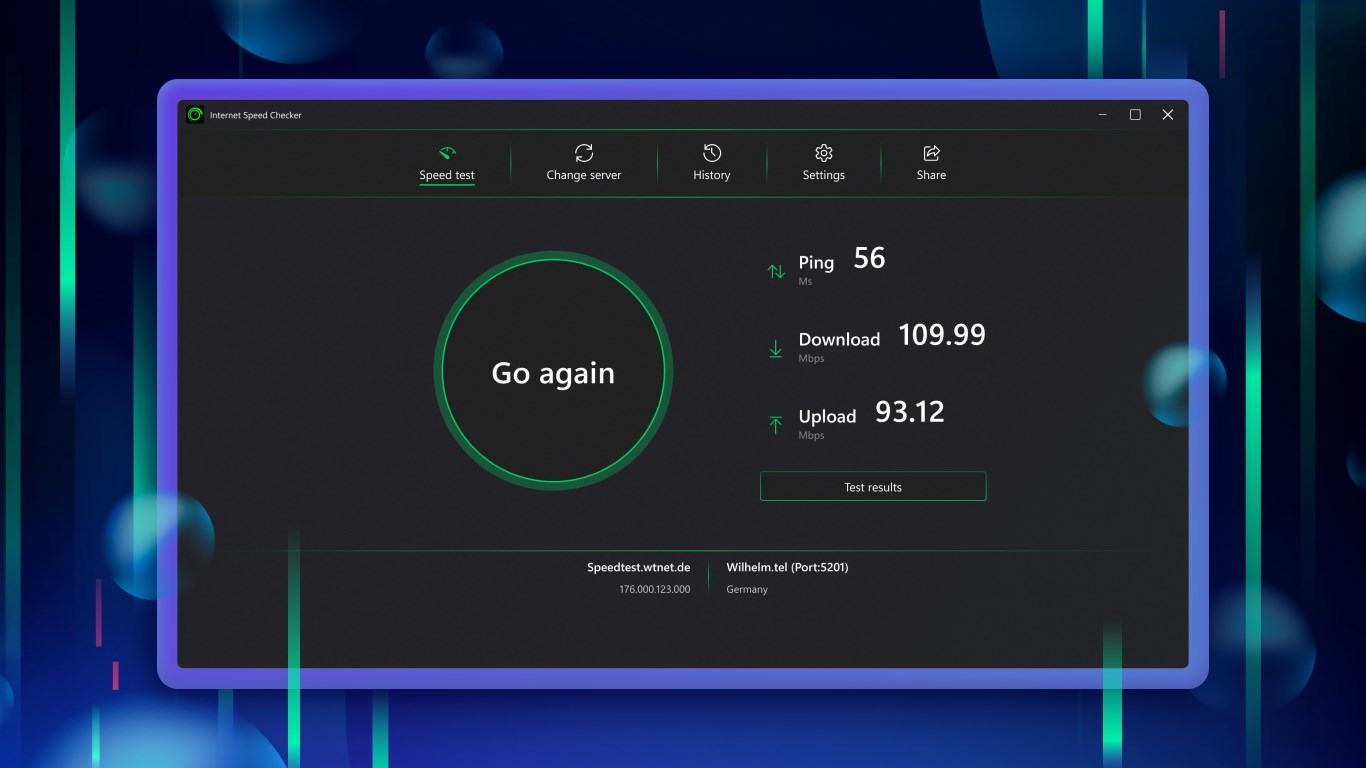 Modern and easy-to-use design lets you check your Internet Speed in a couple of clicks. Also, a high level of measurement accuracy and history of the results should help you to understand the final speed test results.