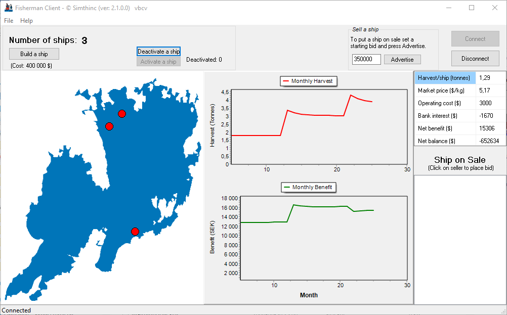 Welcome to Fisherman, the serious game designed for educational purposes to teach Garret Hardin's theory of Tragedy of the Commons, published in 1968. In this game, you will assume the role of a fisherman operating a fishing fleet within a lake, and you will learn about the challenges of managing a shared natural resource.