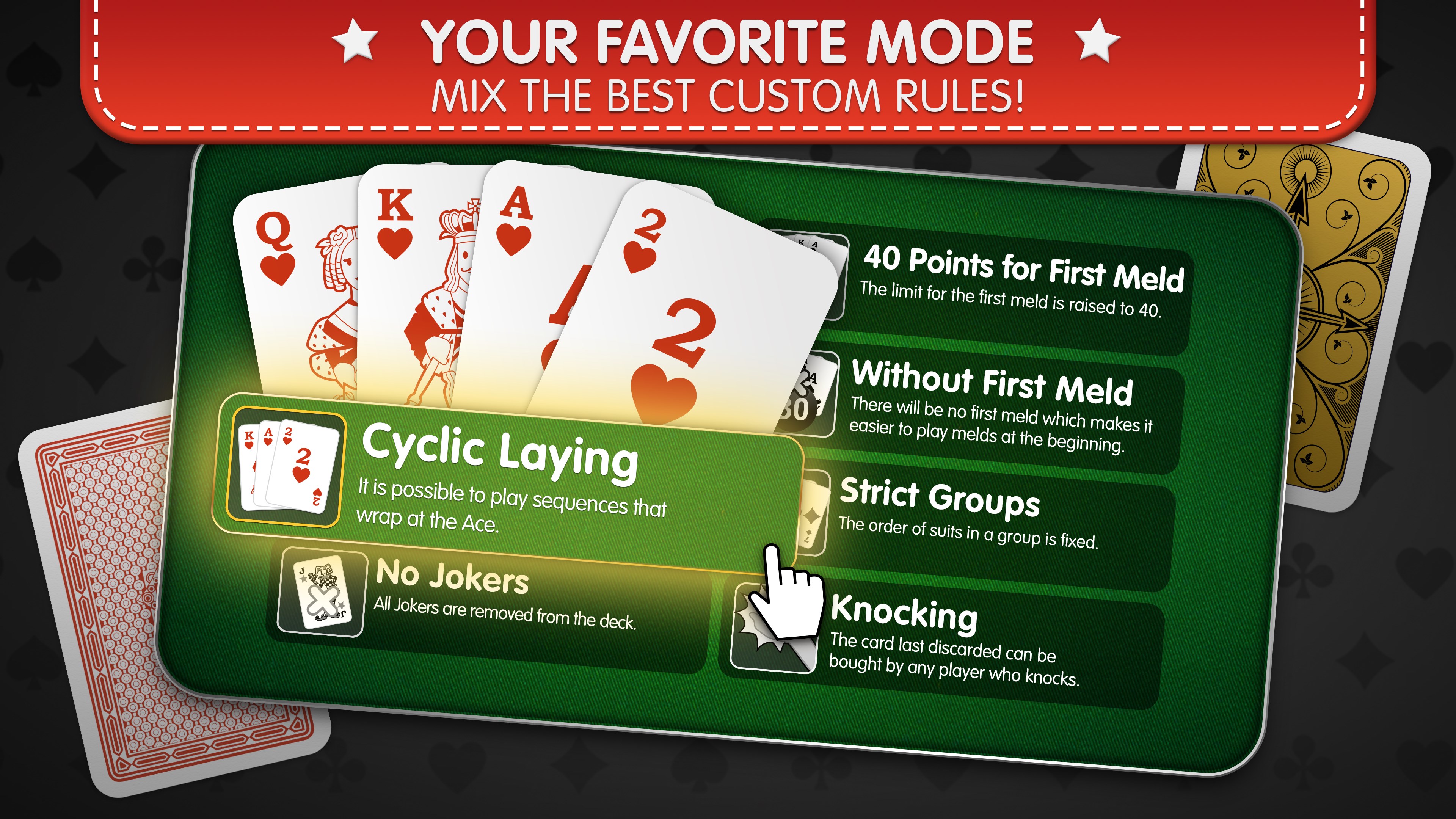 - Discover various special rules: Knocking, 40 Points for First Meld, Short Deck, and more.