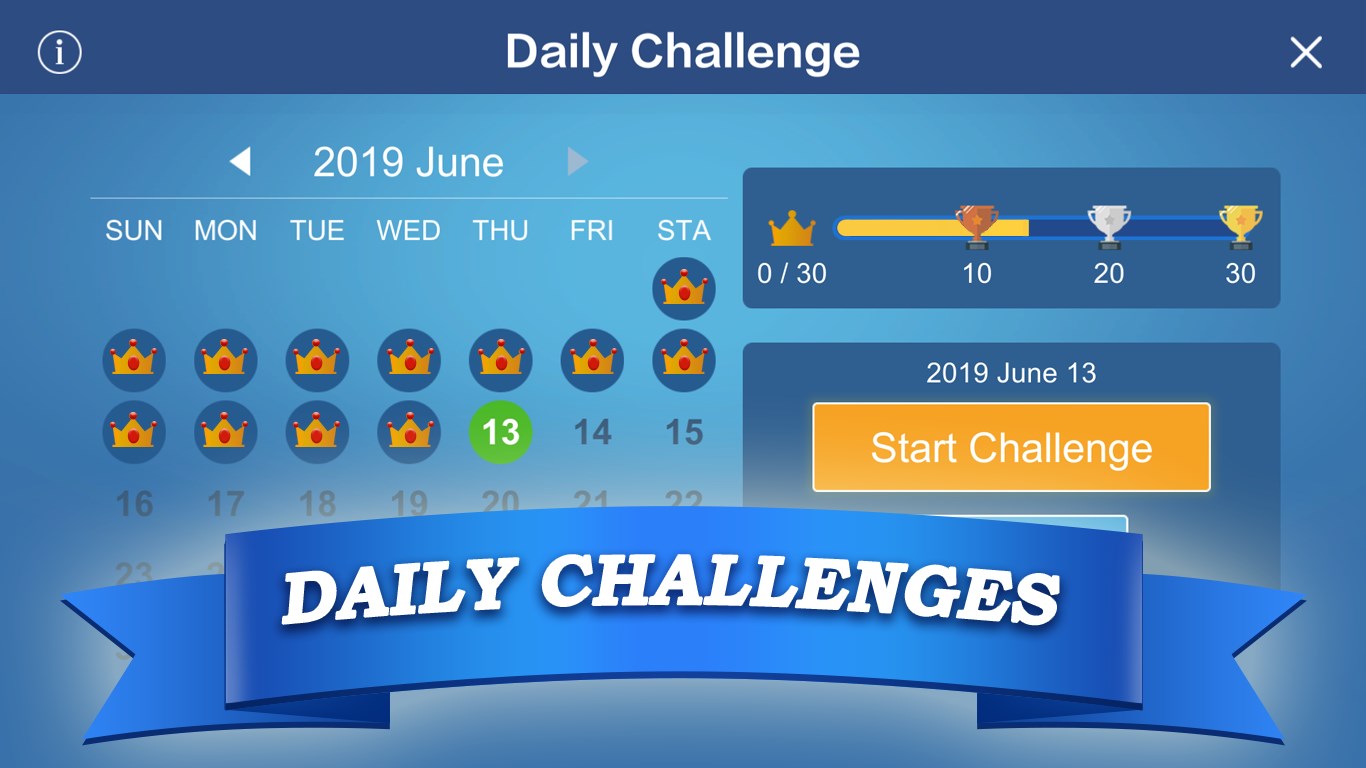 Each day you’ll receive a unique Daily Challenge. Solve the Daily Challenge and receive a crown for that day. Earn trophies each month by winning more crowns! Your Daily Challenges, crowns, and current trophy status are available to view any time. Play the current day’s deal and replay it as many times as you’d like on that day.