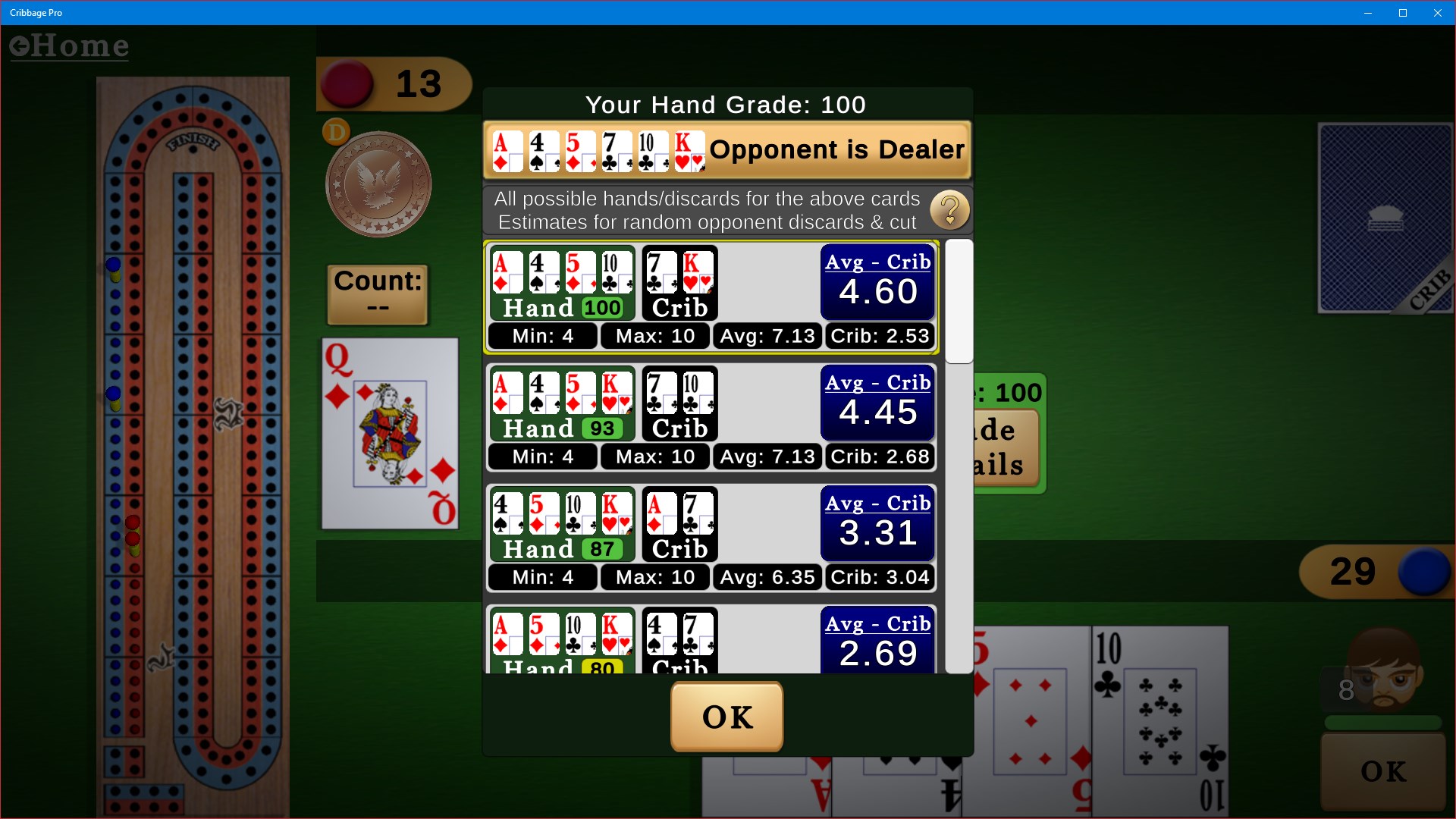 Single player or Online Multiplayer (Cross-Platform Windows, Mac, iOS, Android)3 single player difficulty levelsManual counting option w/ mugginsOptions for auto-play on selection or confirm, auto-cut the deck and more!Multiplayer "tournament" options - Play best of 1, 3, 5 or 7 games to winTrue random shuffleMultiple game boards, backgrounds & cards80+ single player achievements possibleSimple and intuitive game playCustom avatars w/ your Facebook profile pictureDetailed stats & "Top 50" leaderboard - Separate for single player & multiplayerSingle player hints to learn cribbage"Cut for first deal" to balance the oddsAdd a friend, send private messages or chat"Daily Cribbage Scrimmage" Challenges! - Take on a fresh daily challenge, then share with friends to compare your results"Tools & Calculators" - Analyze Discards for a Hand, Score a Hand, or even create your own Game Scenario / Challenge you can play through or share with a friendLeaderboards to track your raking against the world, or just your friends