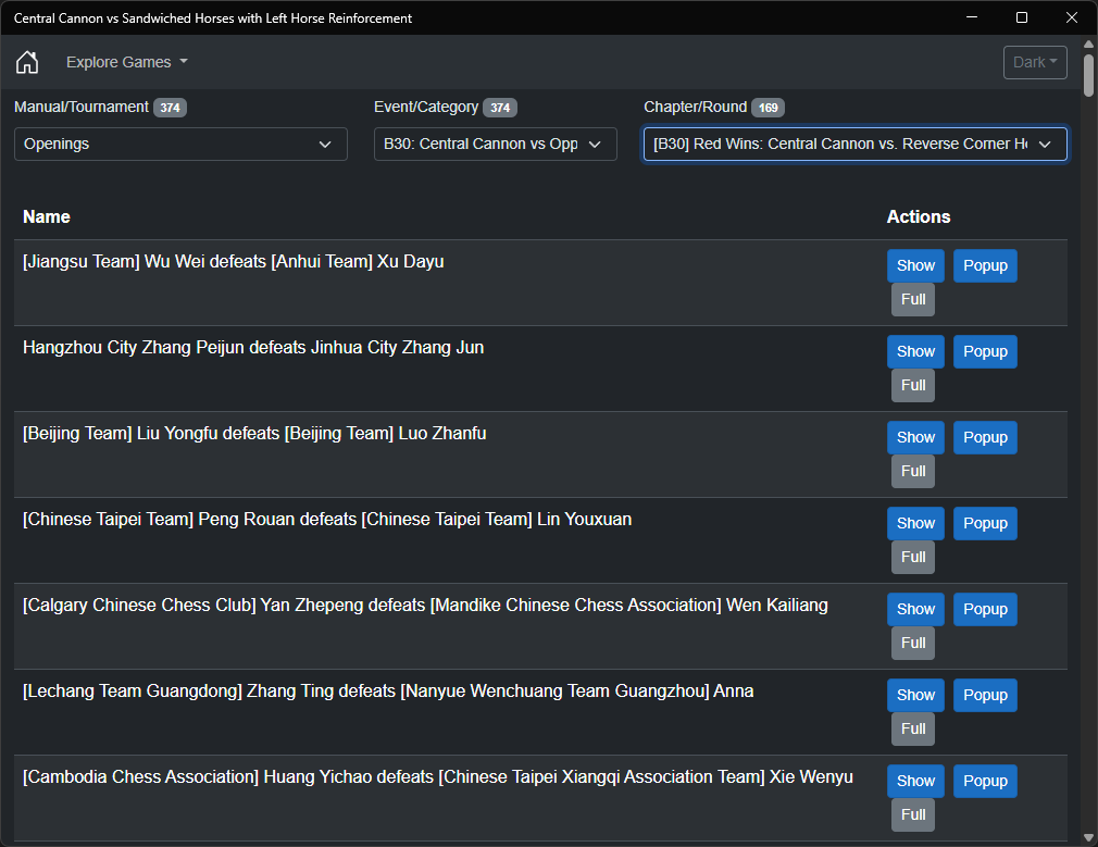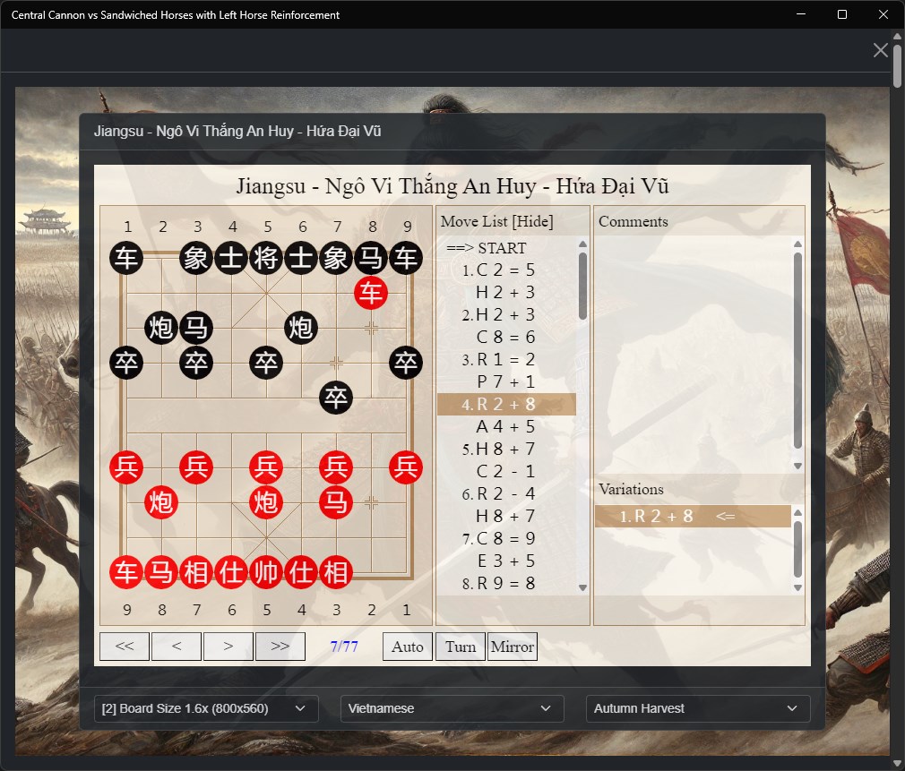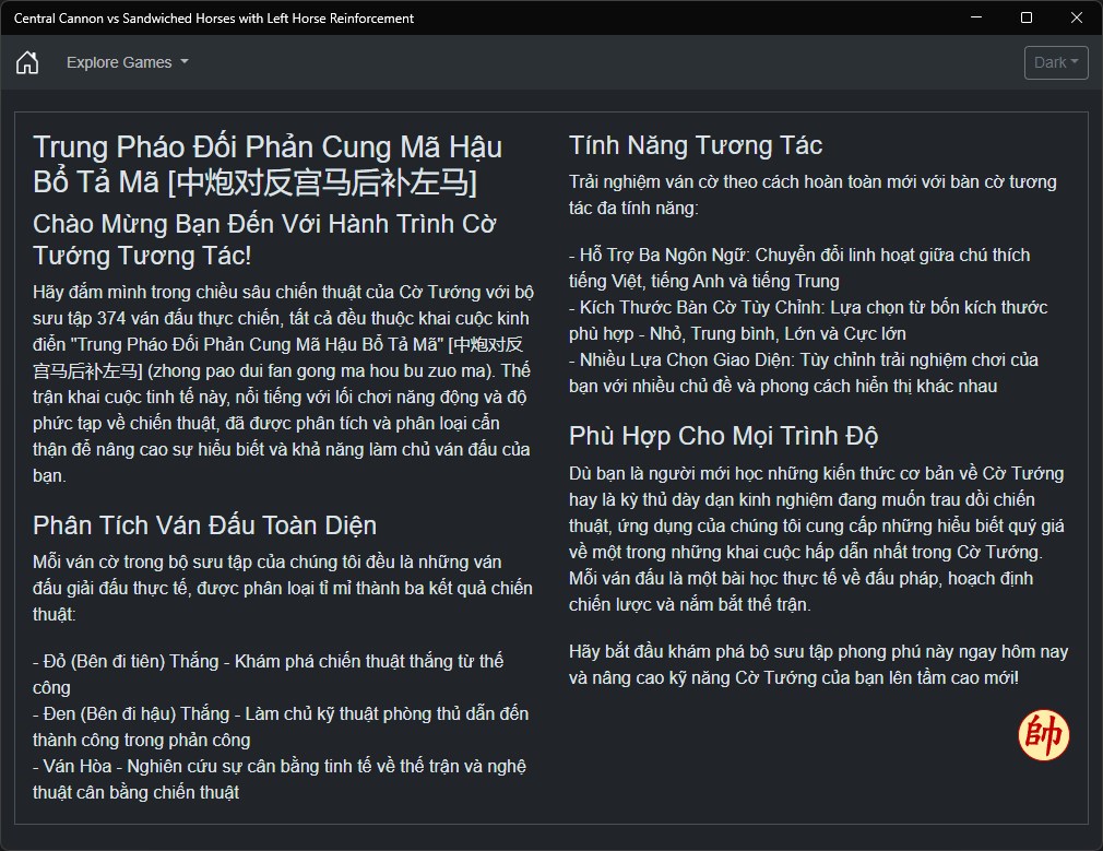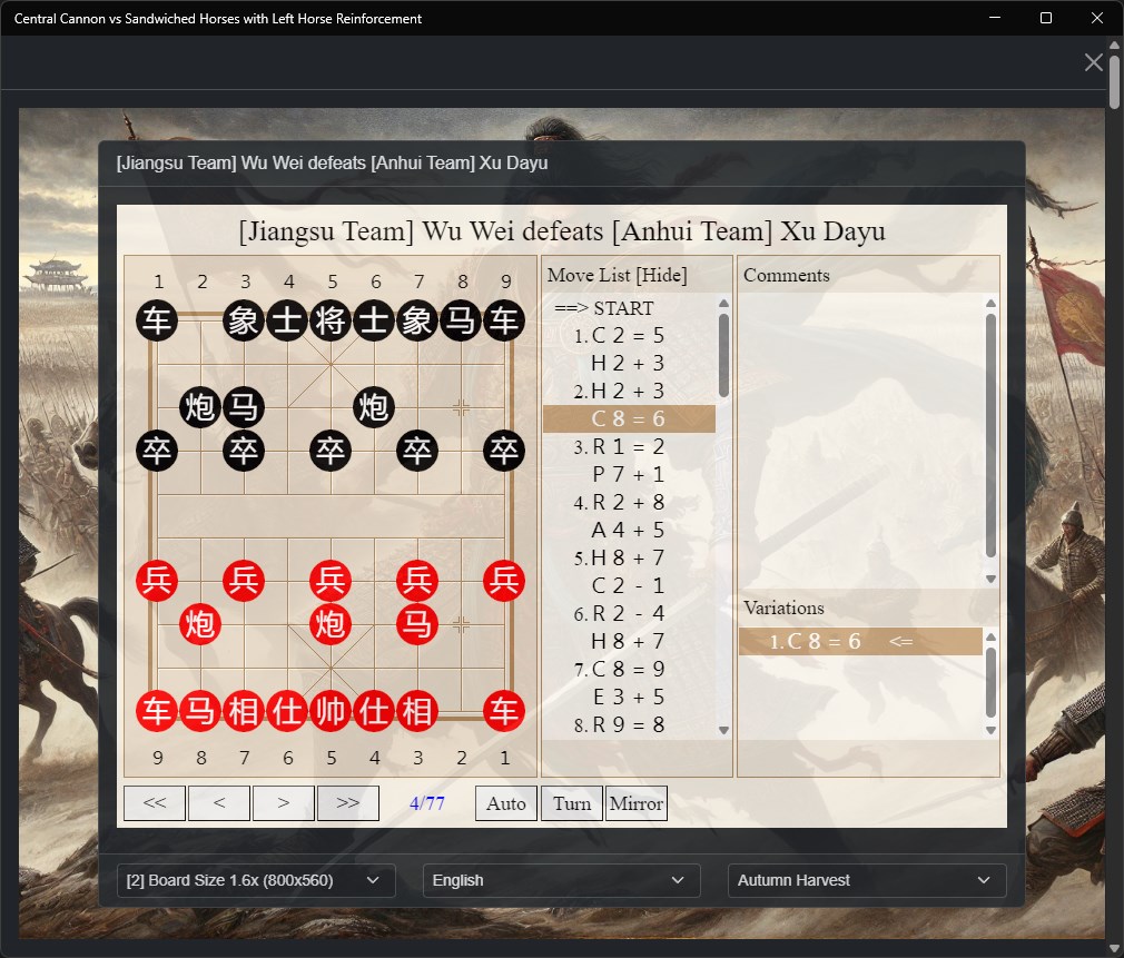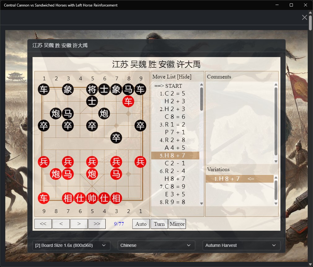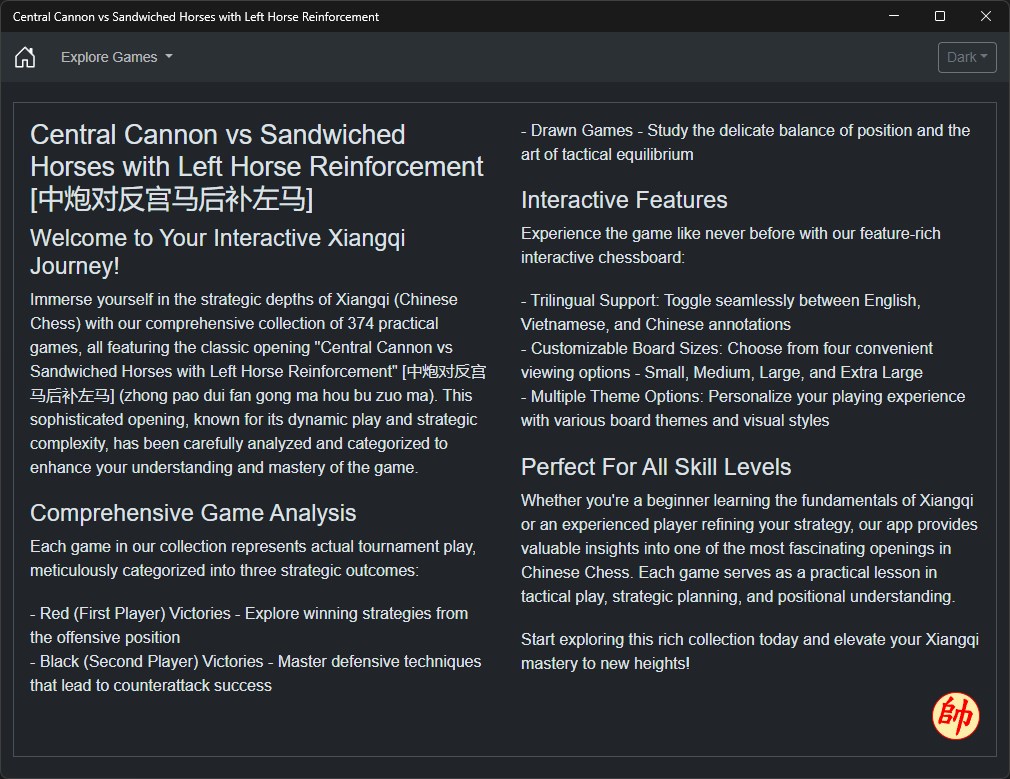 Whether you're a beginner learning the fundamentals of Xiangqi or an experienced player refining your strategy, our app provides valuable insights into one of the most fascinating openings in Chinese Chess. Each game serves as a practical lesson in tactical play, strategic planning, and positional understanding.