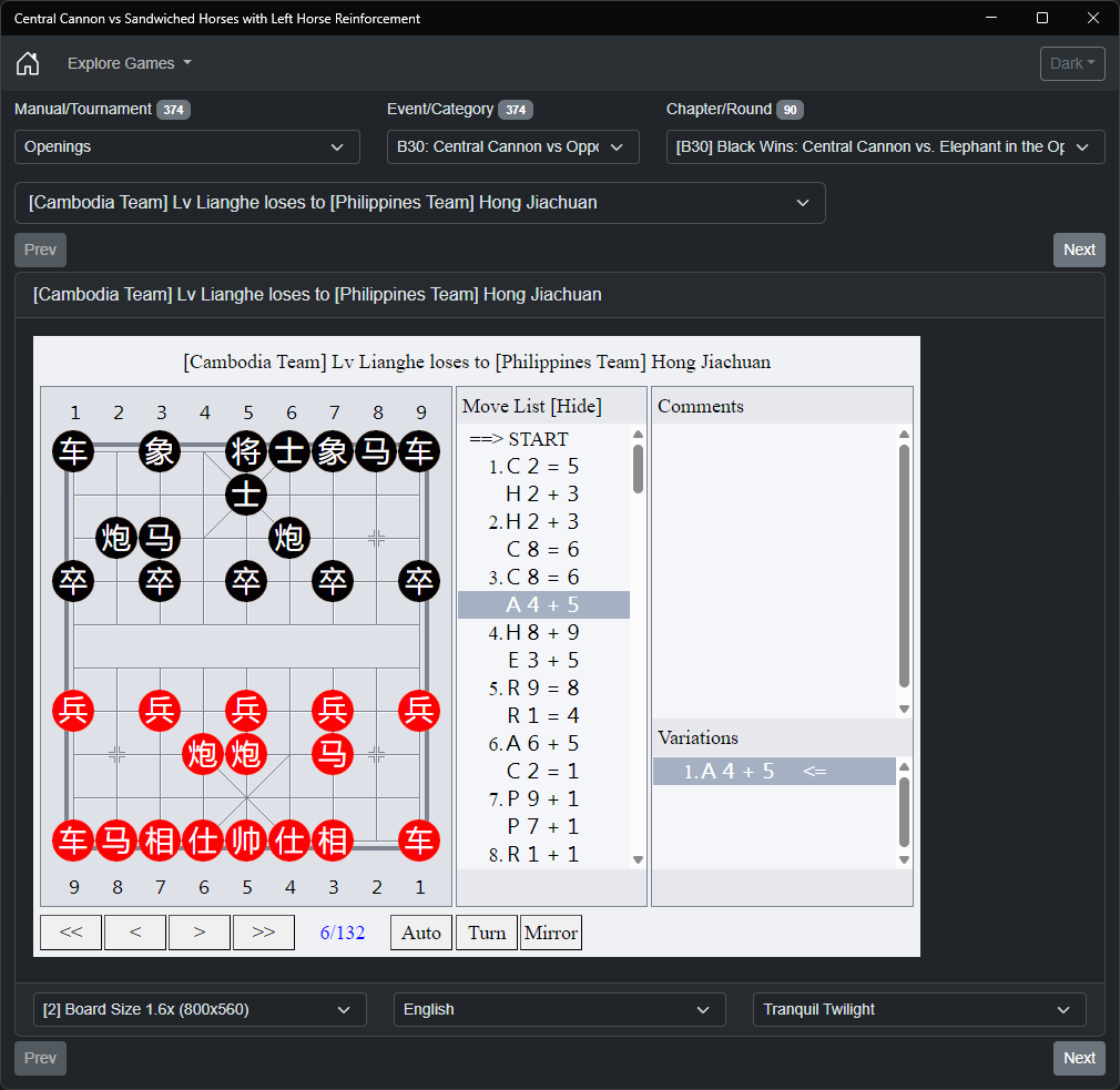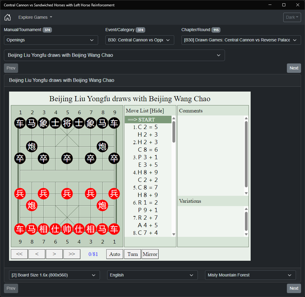 Immerse yourself in the strategic depths of Xiangqi (Chinese Chess) with our comprehensive collection of 374 practical games, all featuring the classic opening "Central Cannon vs Sandwiched Horses with Left Horse Reinforcement" [中炮对反宫马后补左马] (zhong pao dui fan gong ma hou bu zuo ma). This sophisticated opening, known for its dynamic play and strategic complexity, has been carefully analyzed and categorized to enhance your understanding and mastery of the game.