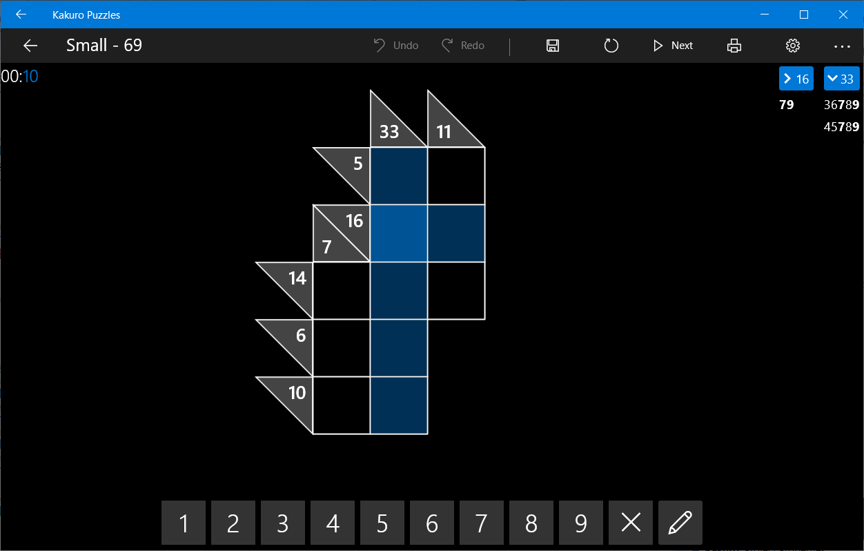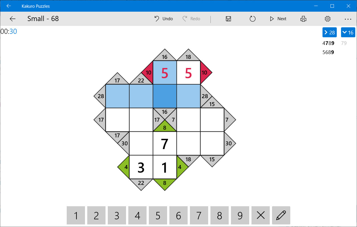 Kakuro, also know as cross sums, is a puzzle game which combines the Sudoku and Crossword principles. Find the right combination of numbers whose sum is the clue written on the edge of the grid. Each digit must be unique in any given sum. You win the game when the grid is completed with the correct digits in every cell.