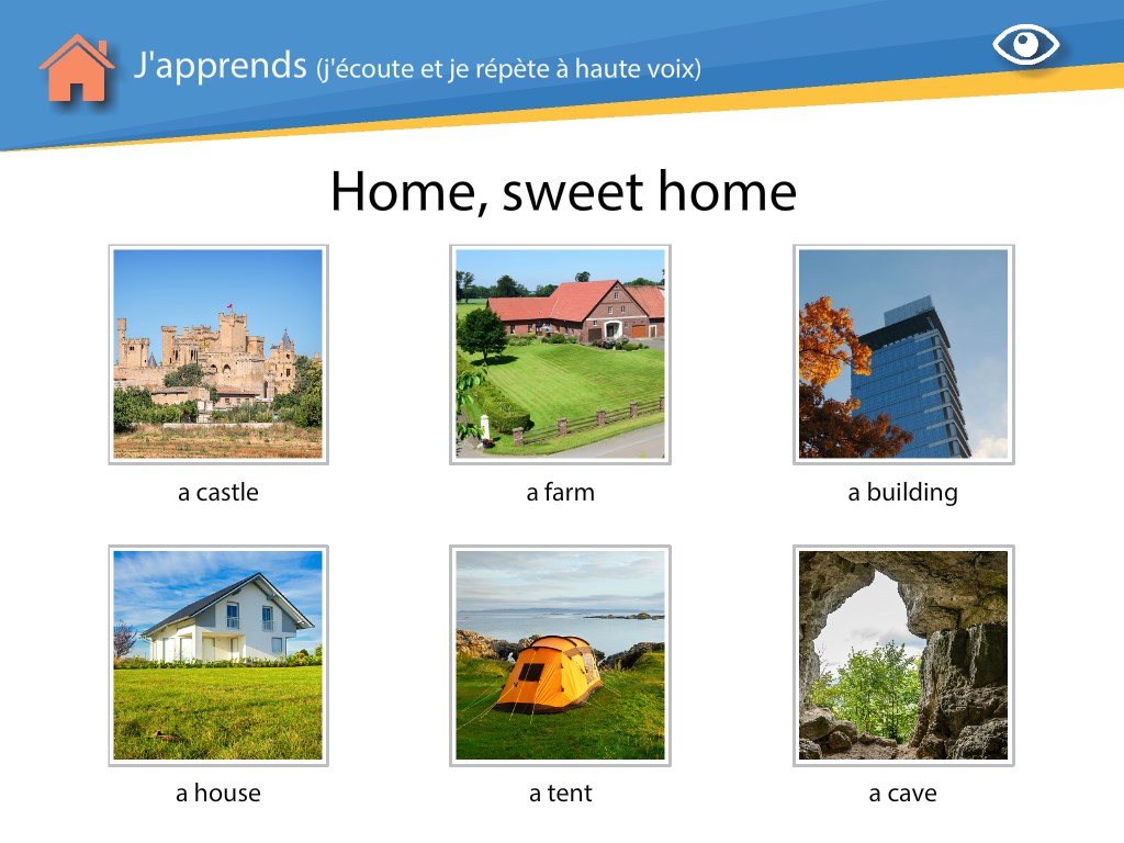 J'apprends : en appuyant sur les images, l'enfant découvre des mots ou des expressions qu'il peut s'entrainer à répéter à voix haute.