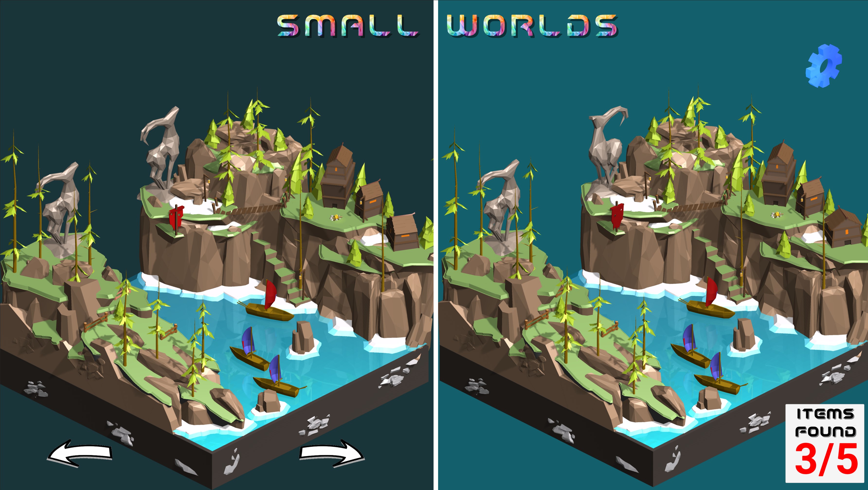 A 3D Spot the Difference: A Novel Spatial Puzzle, small worlds is an immersive puzzle game that challenges players to identify discrepancies between two seemingly identical three-dimensional environments. By leveraging the depth and perspective afforded by three-dimensional space, the game introduces a new layer of complexity to the classic spot-the-difference formula. Players are presented with a pair of visually similar 3D scenes that can be manipulated, rotated and zoomed in, to reveal subtle differences. This interactive exploration encourages critical observation and spatial reasoning as players meticulously examine every angle and detail to uncover the disparities. The game's 3D nature offers a more engaging and challenging experience compared to traditional 2D variants, demanding a higher level of visual acuity and spatial awareness from players.