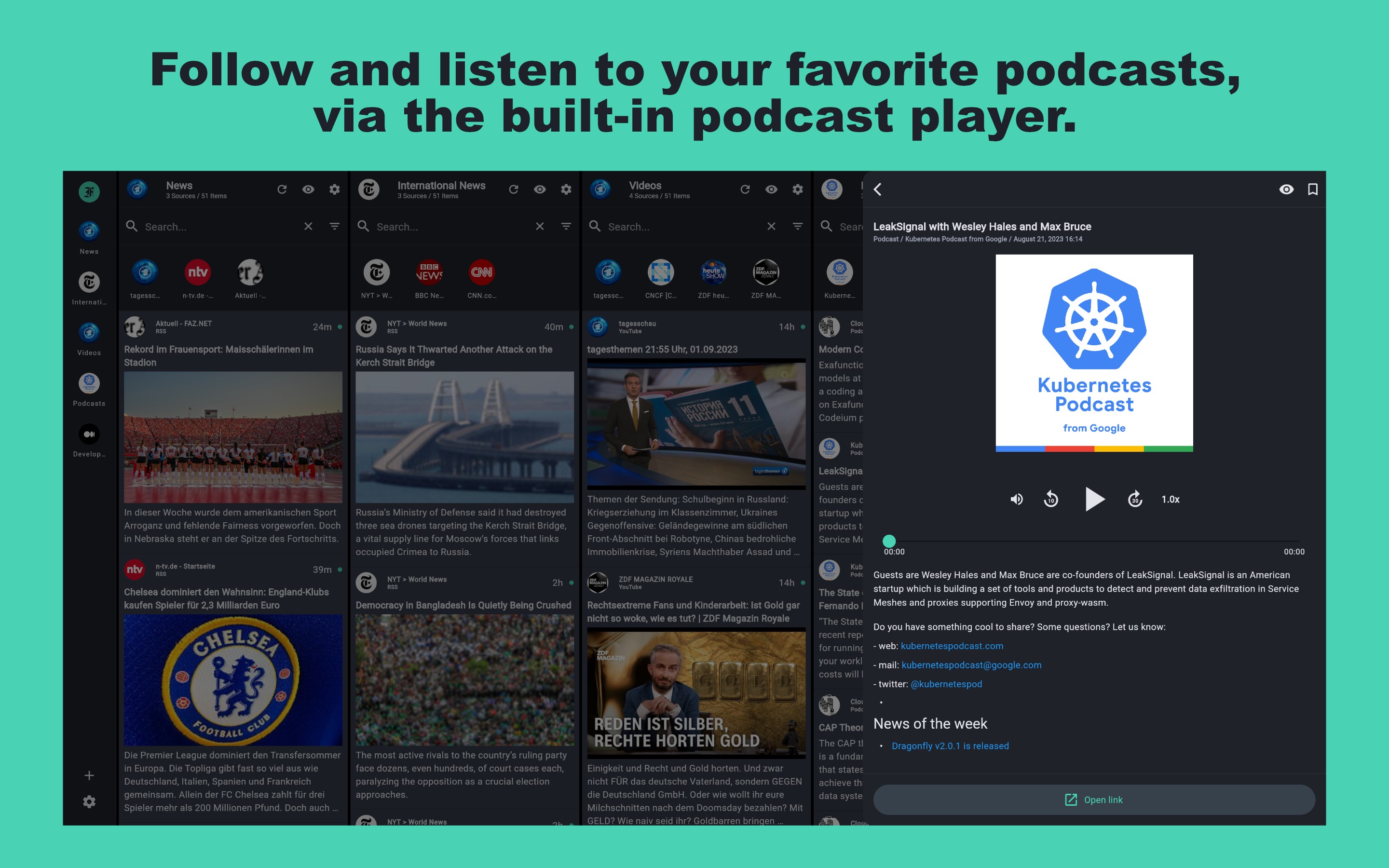- Podcasts: Follow and listen to your favorite podcasts, via the built-in podcast player.