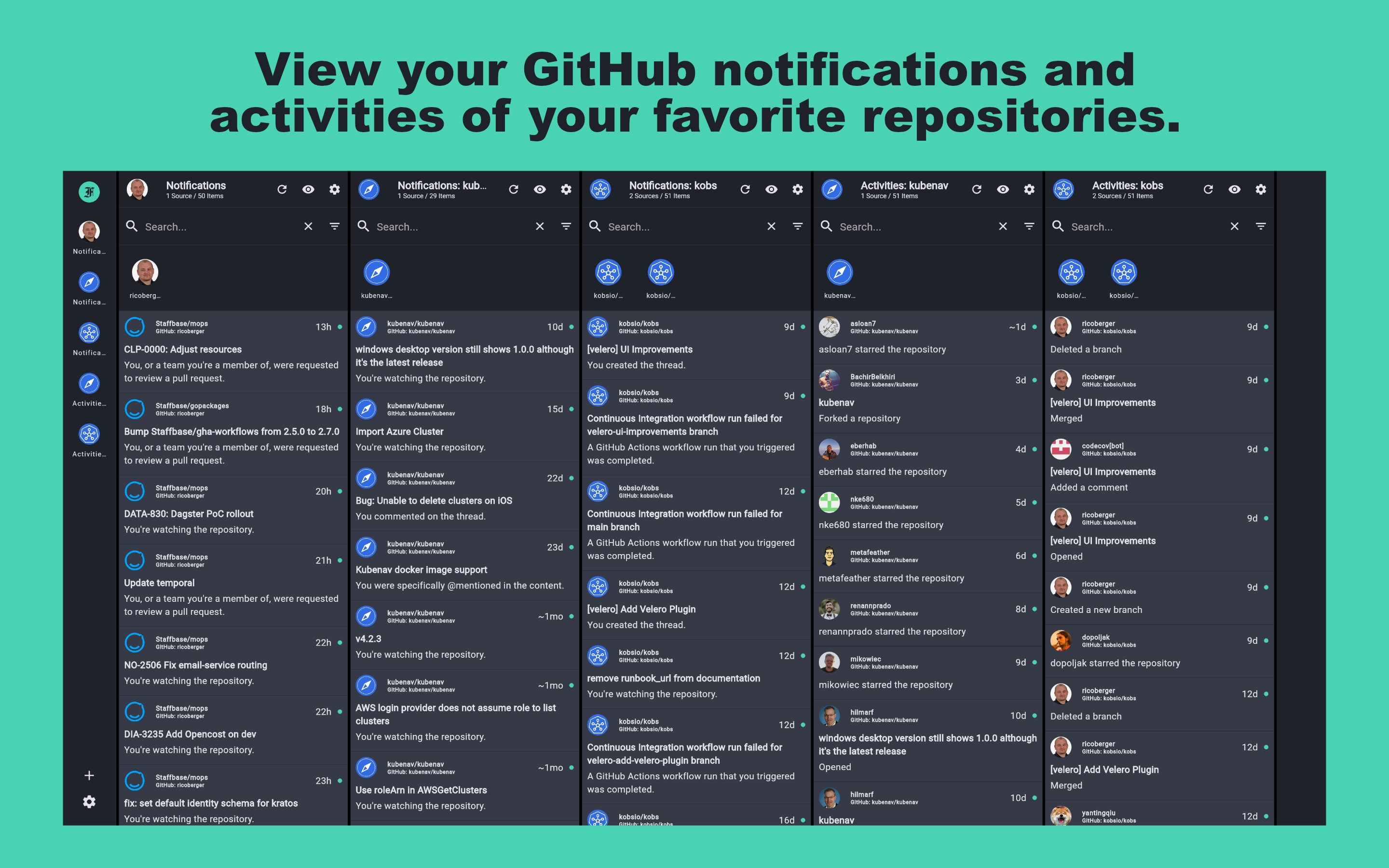 - GitHub: Get your GitHub notifications and follow your repository activities.