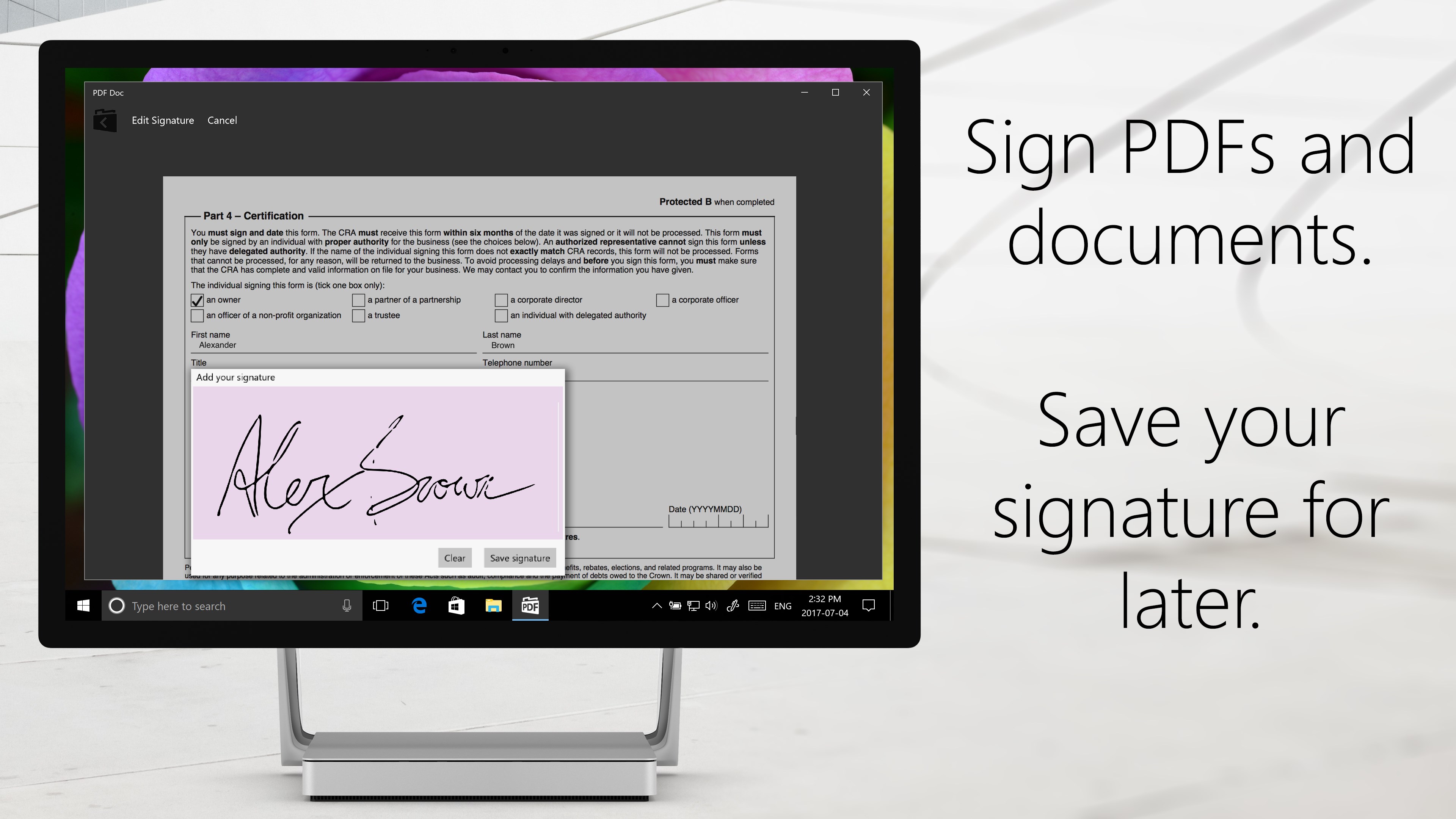 Quickly view Adobe PDF, Word Doc, and DocX filesSign PDFs and docsFill in PDFs with your pen, touchscreen, or mouseConvert DOC files to PDF in one clickSave your signature for quick PDF signing