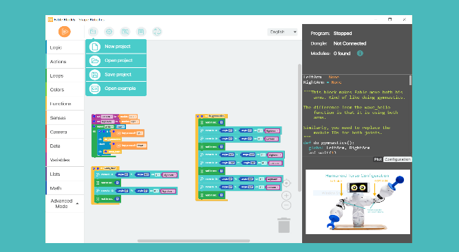 Fable Blockly is the official programming app for the Fable System. Fable is a modular robot that allows you to build advanced custom robots in seconds. With the Fable System you can for example create walking robots, social robots, industrial robots, snake robots and much more. Once you have assembled your robot, you can bring your creation to life by using Fable Blockly’s intuitive block based programming environment or by using the built-in Python editor.