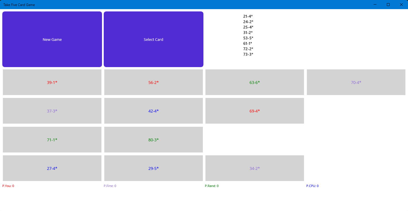 You can now take the fun of Take Five with you!! Click the New Game button and you and your 3 competitors will be dealt 10 cards. The cards you select will be placed into the one of the four rows. The card will go next the row with the smallest difference between your card and the last card in the row. You don't want your card to be in the Fifth position of the row, then you will take the points for all of the card in that row.
