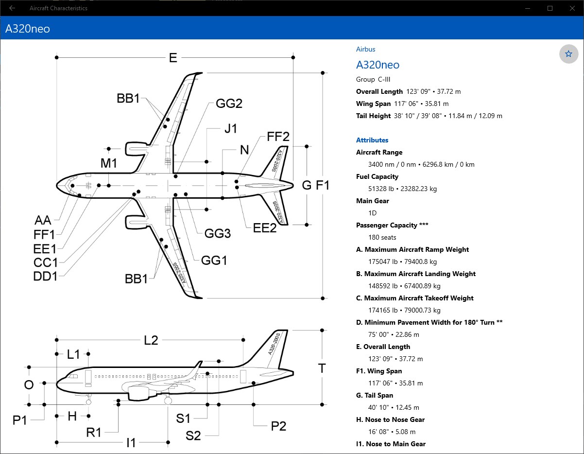 Find fast facts like ramp weight, wingspan, tail height, passenger capacity and more at the touch of a button.