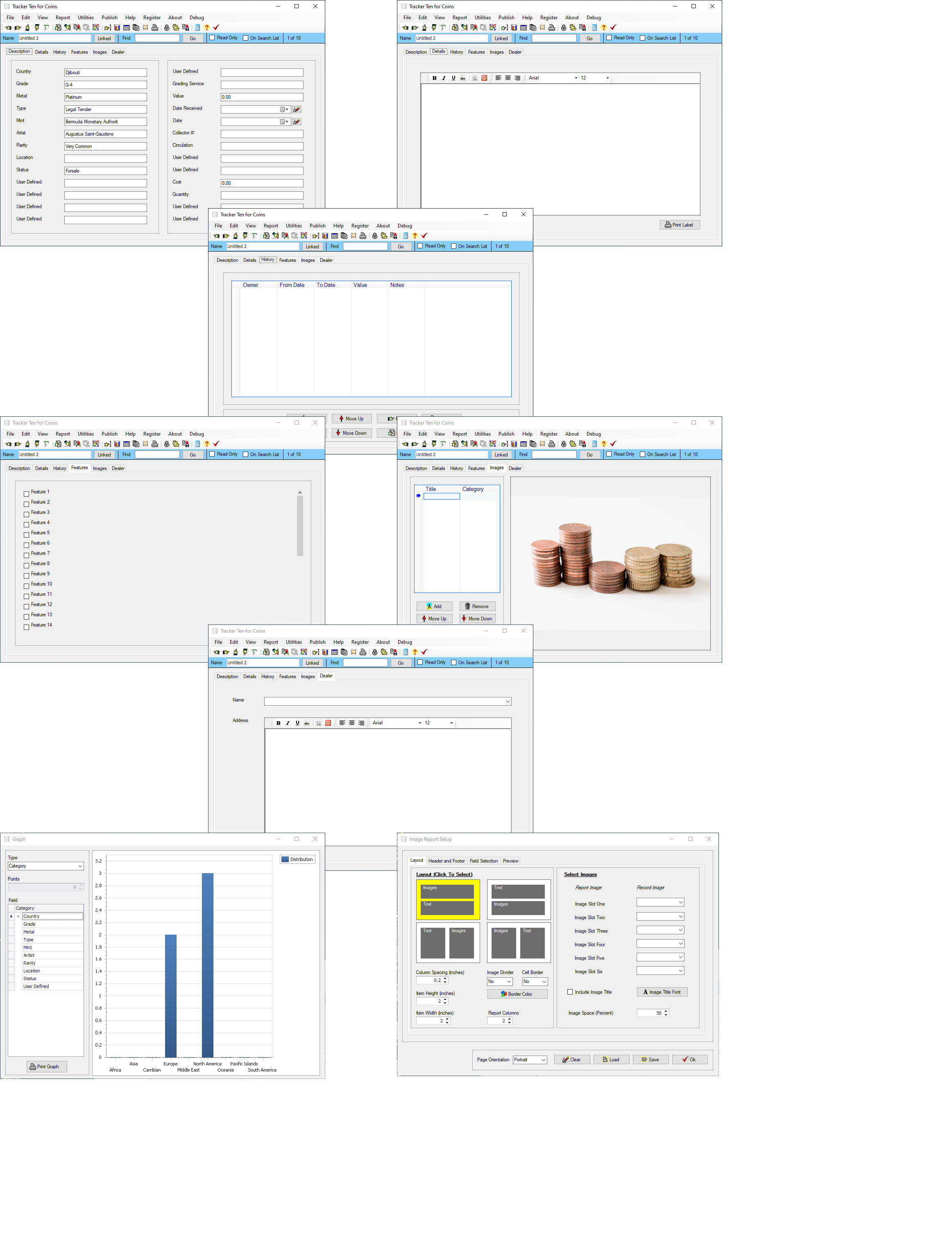 Sample fields include country, grade, metal, type, mint, artist, rarity, location, status, grading service, value, date received, date, collector #, circulation, cost and quantity.Very easy to learn and use.Online help file.Numerous user defined fields so you can setup the software to suit your exact needs.Number and Date reports showing upcoming reminders.Rich text format notes areas for customer details and notes.30 Customizable feature tracking check boxes.Dealer name and contact information tracking area.Rich text format notes areas for each record.Advanced multi-level nested item categorization system.Quick and Easy Data Entry with Customizable Pull Down Menus.Powerful Data Sorting and Filtering.Simple and easy cut, copy, insert and record navigation functions.Multiple Image Support (up to 100 pictures for each record !). All major image types are supported (i.e. bmp, jpg, gif, png etc.).Easily incorporate pictures from your Digital Camera or Scanner. Also attach and view PDF equipment manual files in Image area.Full color image reports.Powerful and Intuitive Search Functions that let you quickly and easily retrieve the data you need Comma delimited data import.Multiple Data Views Including Spreadsheet, Album View (allowing you to visually view different items in your inventory side by side) and 3-dimensional full color Graphs showing inventory breakdown.Data export features allowing you to transfer data to spreadsheets or other software programs.