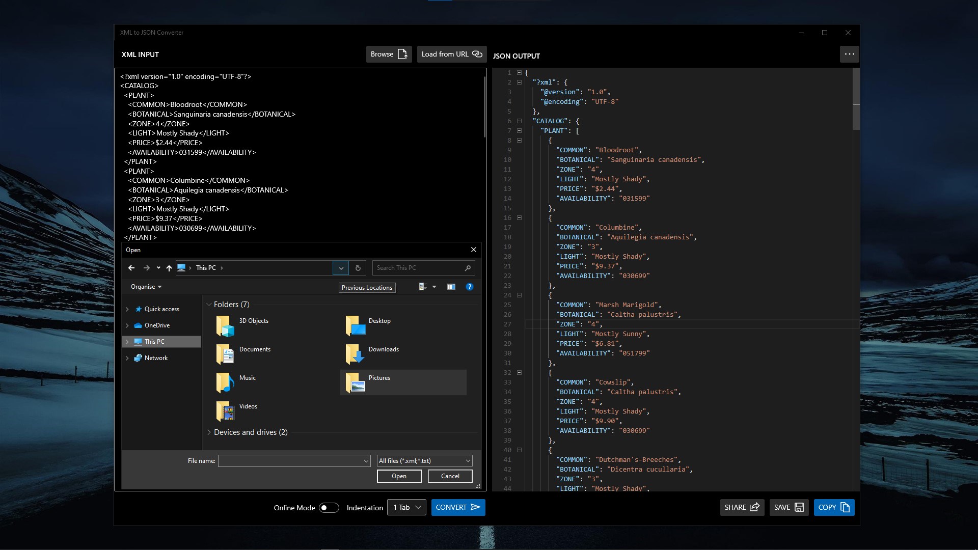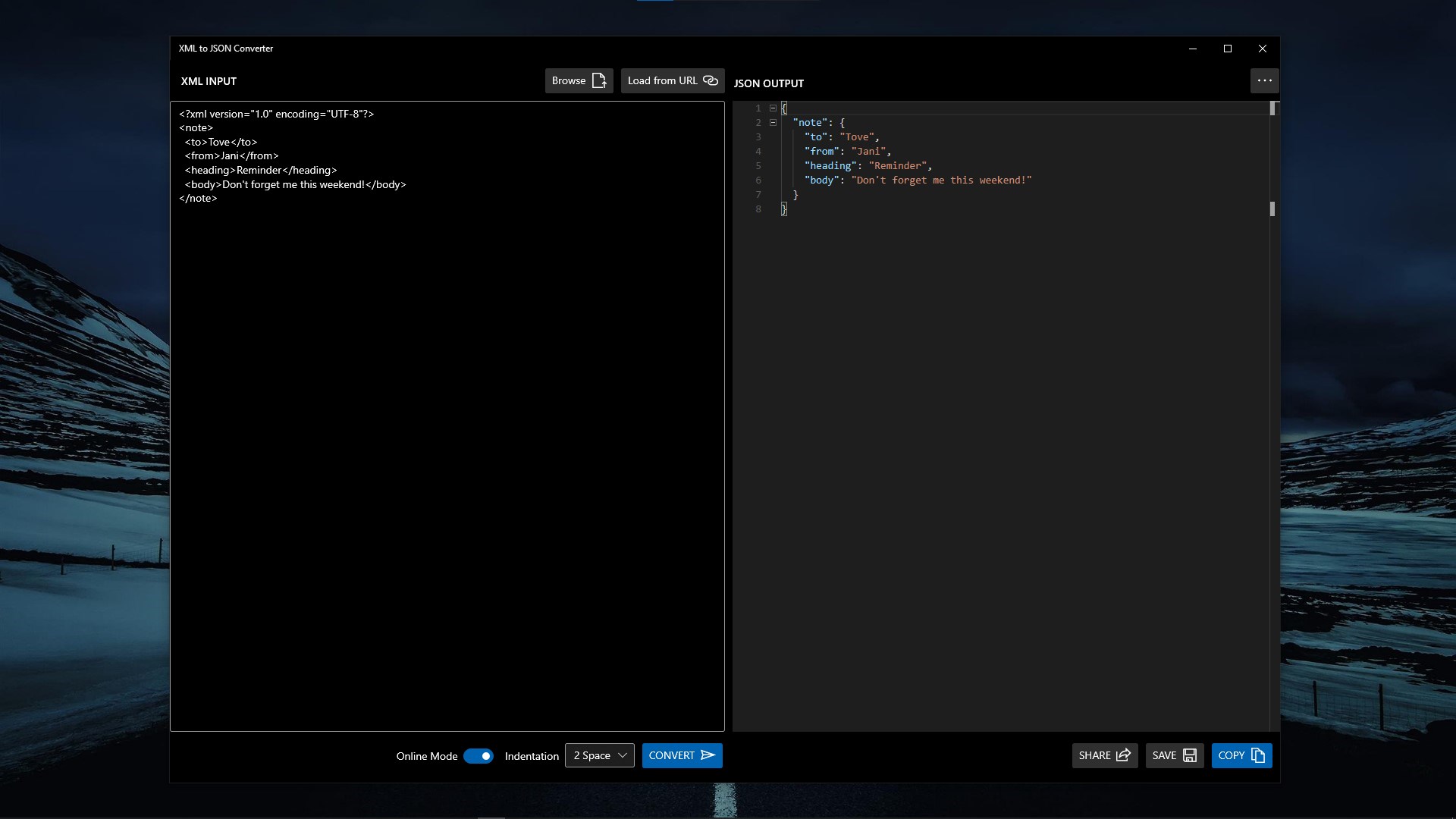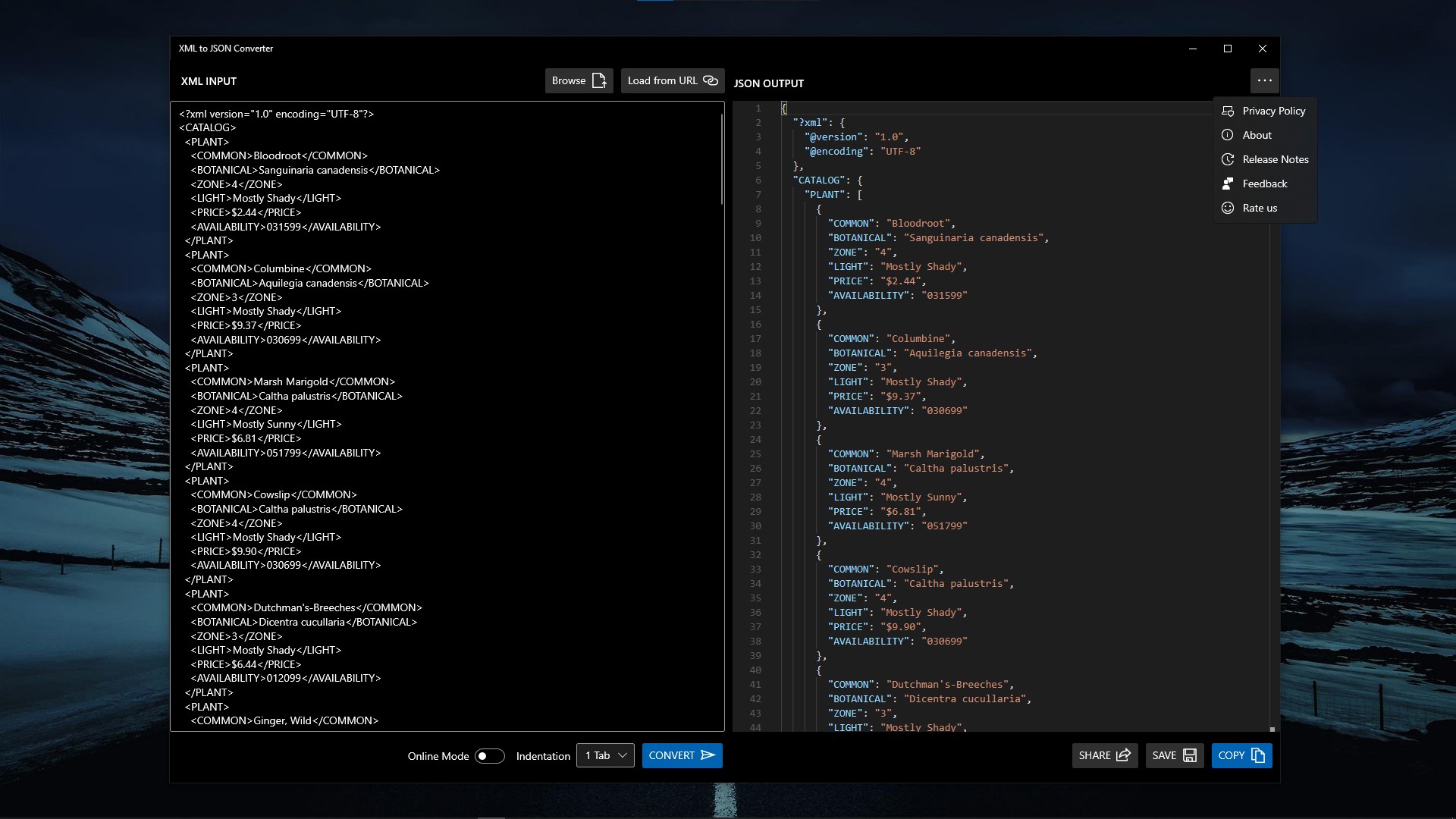 XML to JSON ConverterSupports Online Mode for XML to JSON ConversionSupports custom indentation for JSON outputSupports loading XML input from URLSupports loading XML input from Local DiskSupports saving output in Local DiskSupports sharing output through native Share UISupports copy to Clipboard of outputSupports Acrylic Effects for UISupports both Dark Theme and Light Theme