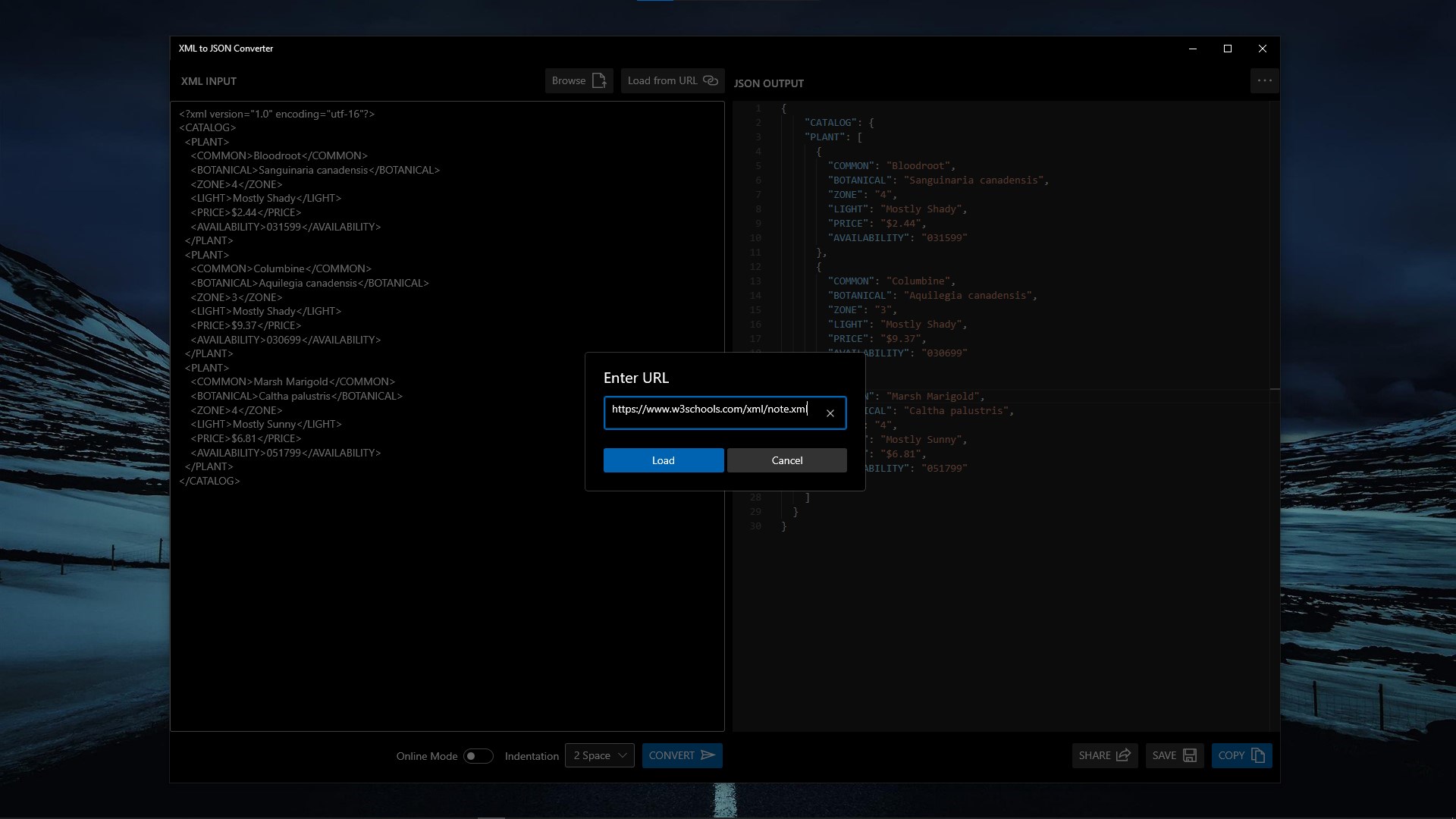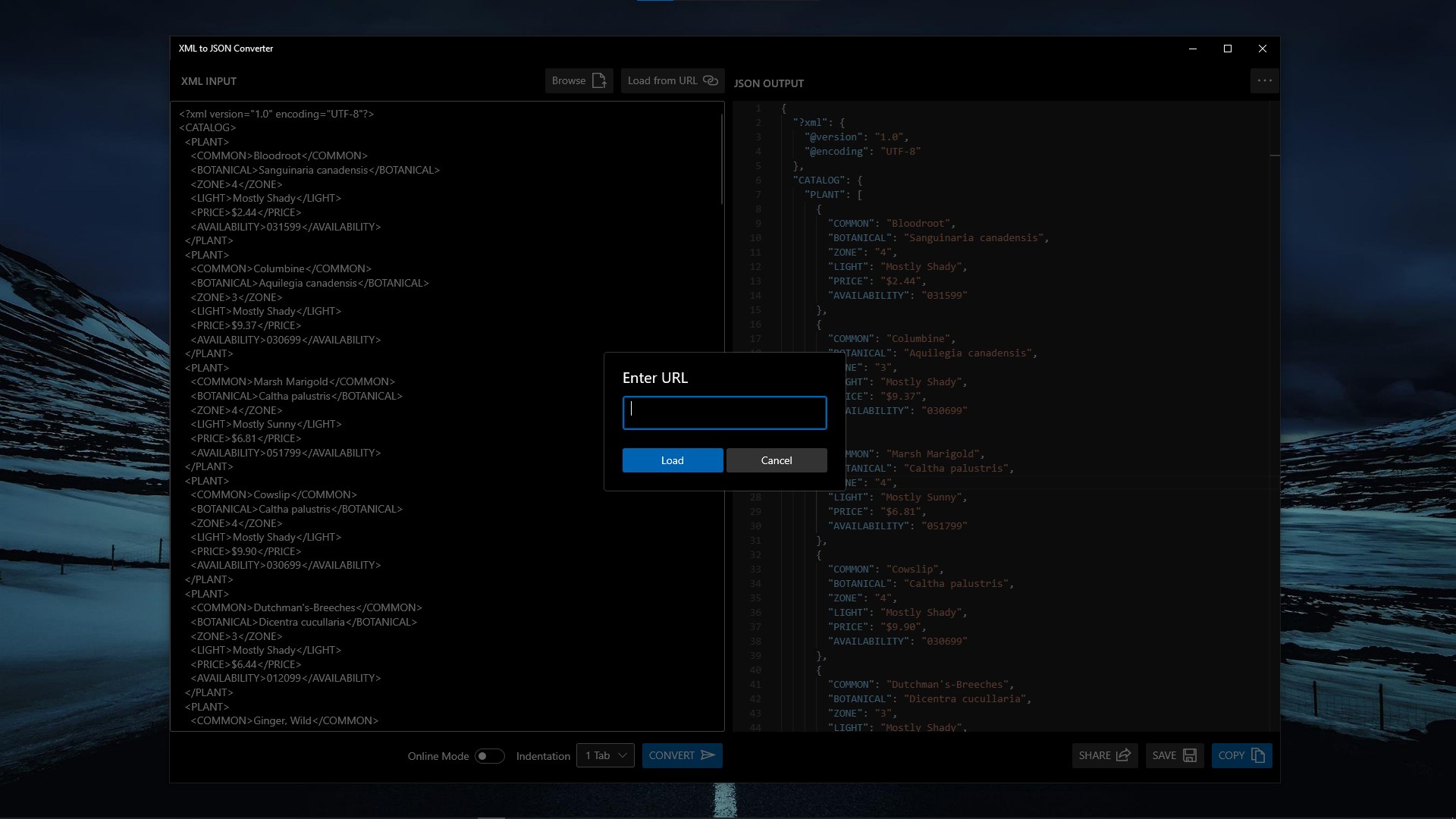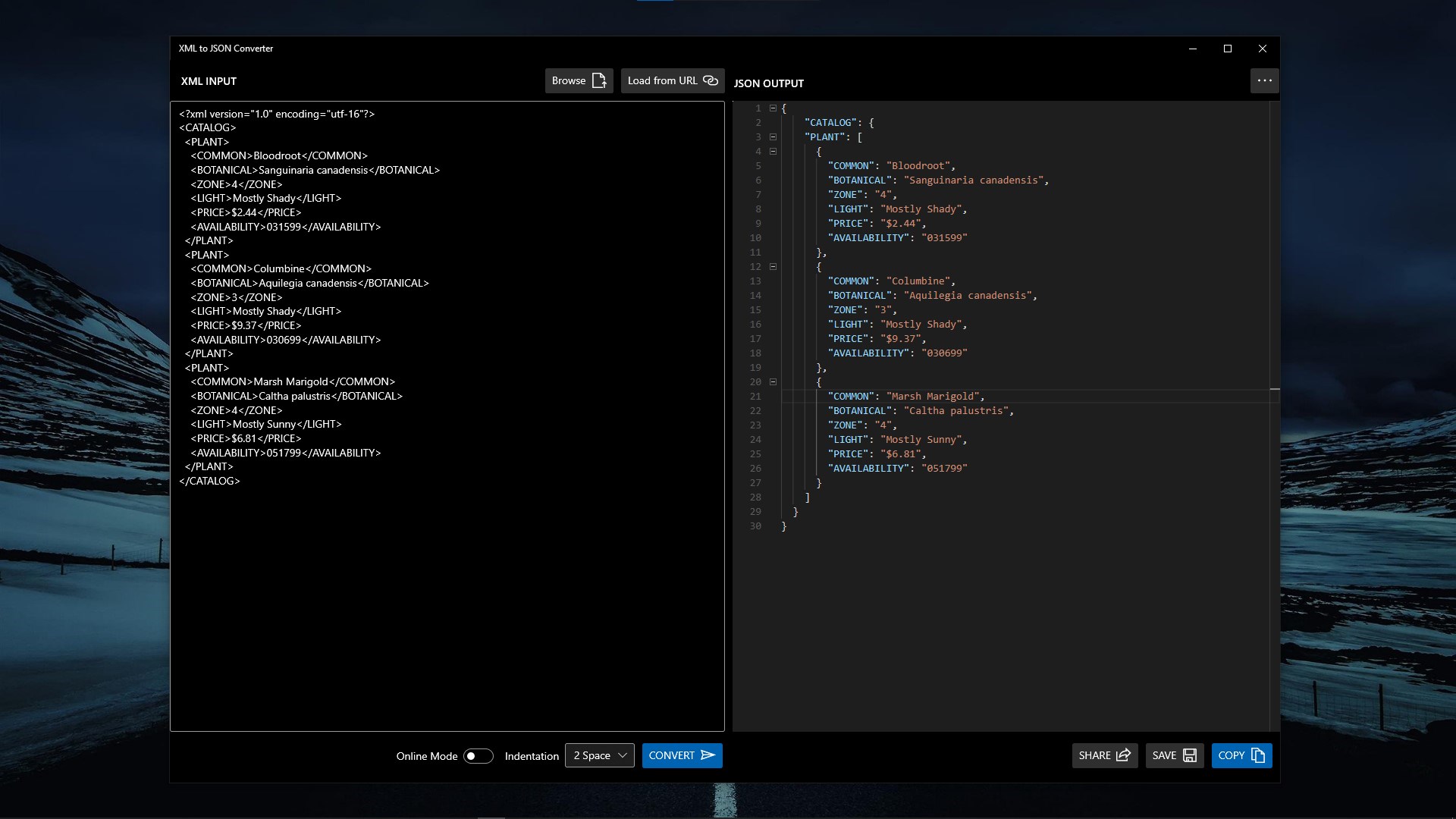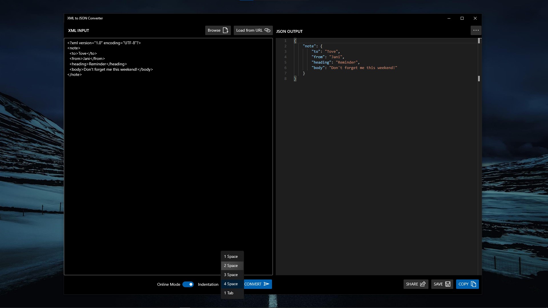 XML to JSON ConverterSupports Online Mode for XML to JSON ConversionSupports custom indentation for JSON outputSupports loading XML input from URLSupports loading XML input from Local DiskSupports saving output in Local DiskSupports sharing output through native Share UISupports copy to Clipboard of outputSupports Acrylic Effects for UISupports both Dark Theme and Light Theme