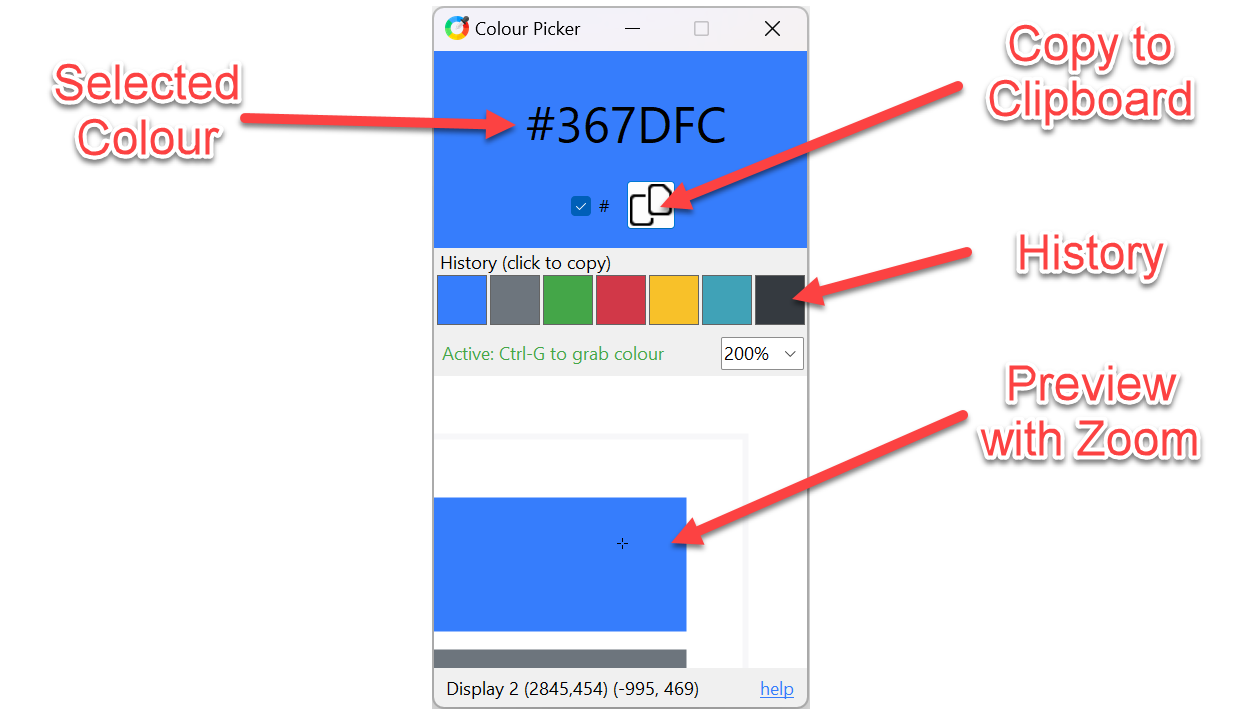 Supports multiple monitors (including 4K)Supports Monitors at different scale settingsStores a history of selected colours