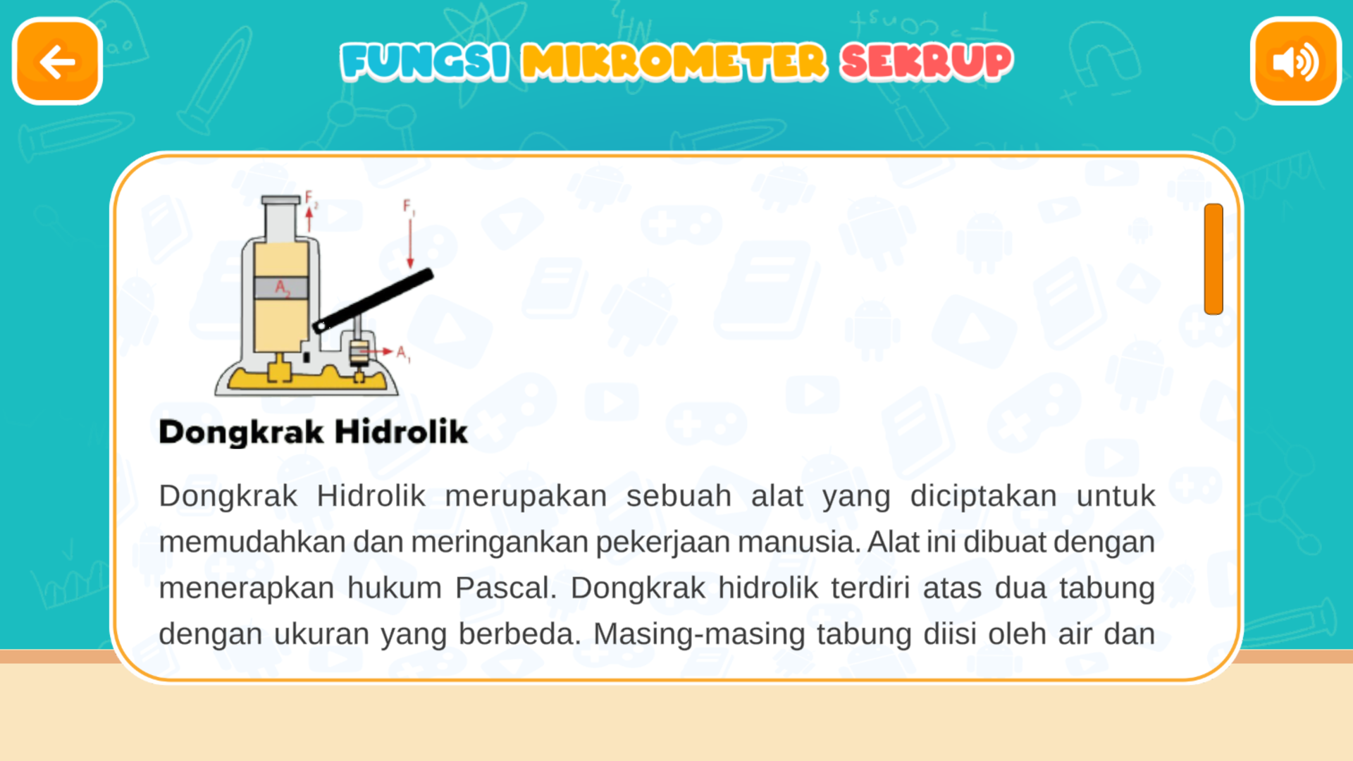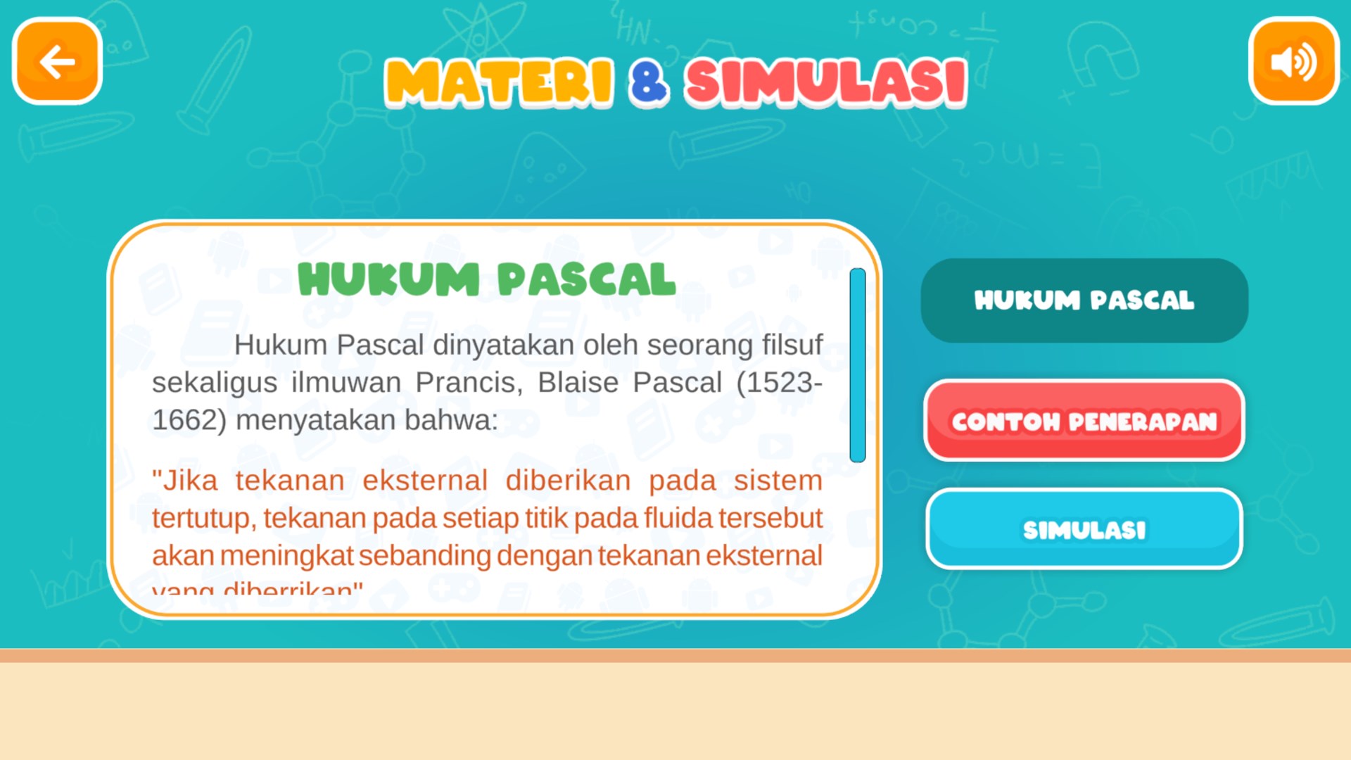 Fisika Hukum Pascal Aplikasi ini berisi pembelajaran tentang hukum pascal fisika yang disajikan dengan tampilan simulasi proses terjadinya hukum pascal. Terdapat juga contoh penerapan di kehidupan sehari hari.