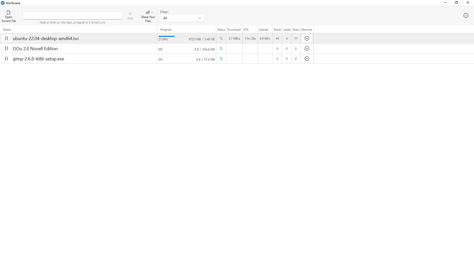 WinTorrent app provides an implementation of BitTorrent protocol for Windows 10/11 in the modern WinUI interface. It's fast and easy to use. To download, you can open a .torrent file from your disk, click on a magnet link from your browser, or just copy and paste the info hash. You can also share your files to BitTorrent network. No background service, no auto startup, just open the app to download, then close it to stop all torrents.