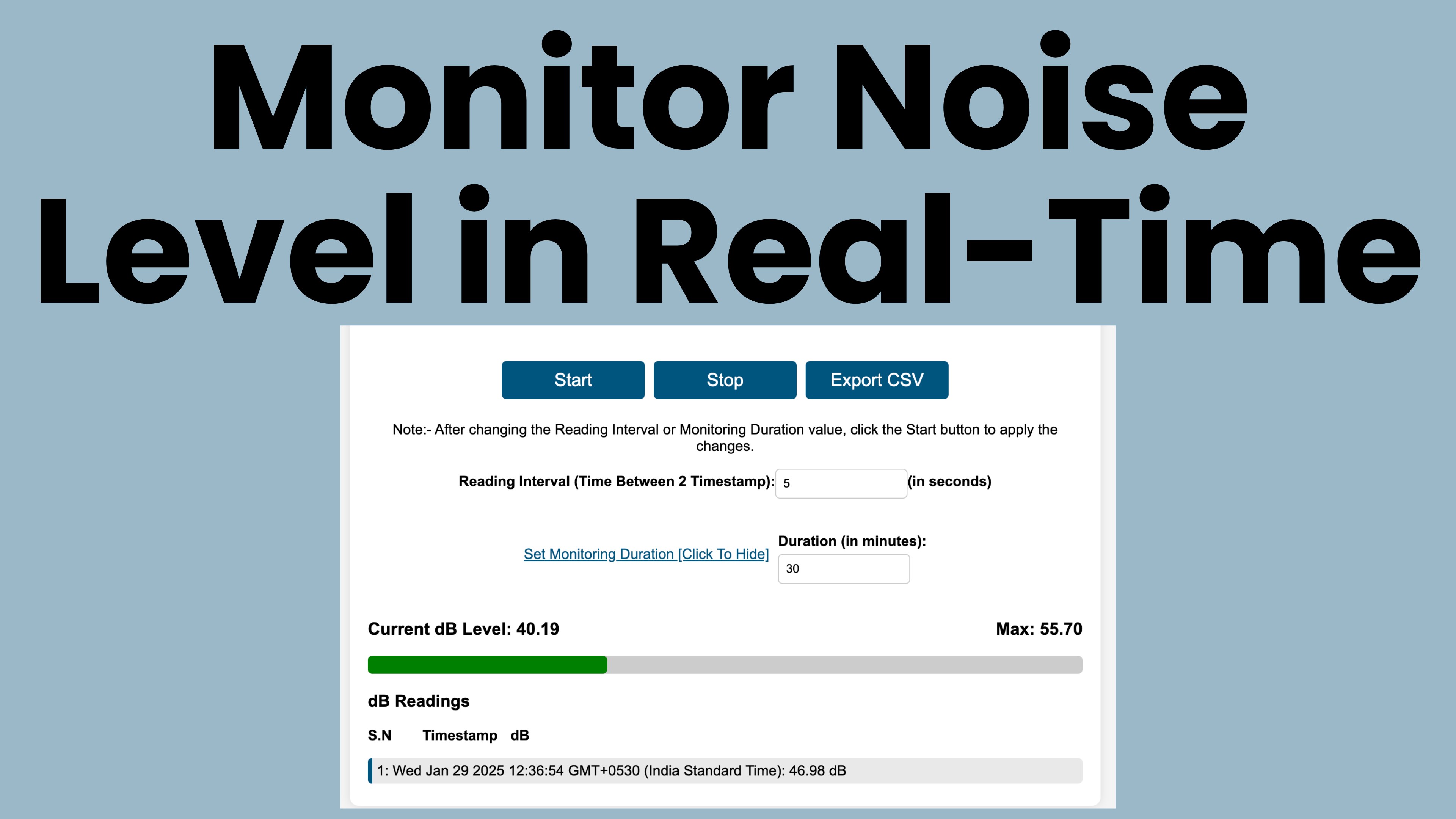 Real-Time Noise Monitor – Instantly measure and display surrounding noise levels in decibels (dB).Current & Max dB Levels – View live noise readings along with the highest noise level recorded.Start & Stop Measurement – Control monitoring with a simple Start and Stop button.CSV Export for Noise Data – Save recorded noise levels along with date, day, time, and dB level for analysis.Set a custom timestamp interval (in seconds) to control how often data is logged in the CSV file.Define the monitoring duration (in minutes or hours) to automatically stop noise recording.Easy-to-Use Interface – Simple, intuitive design for a smooth user experience.