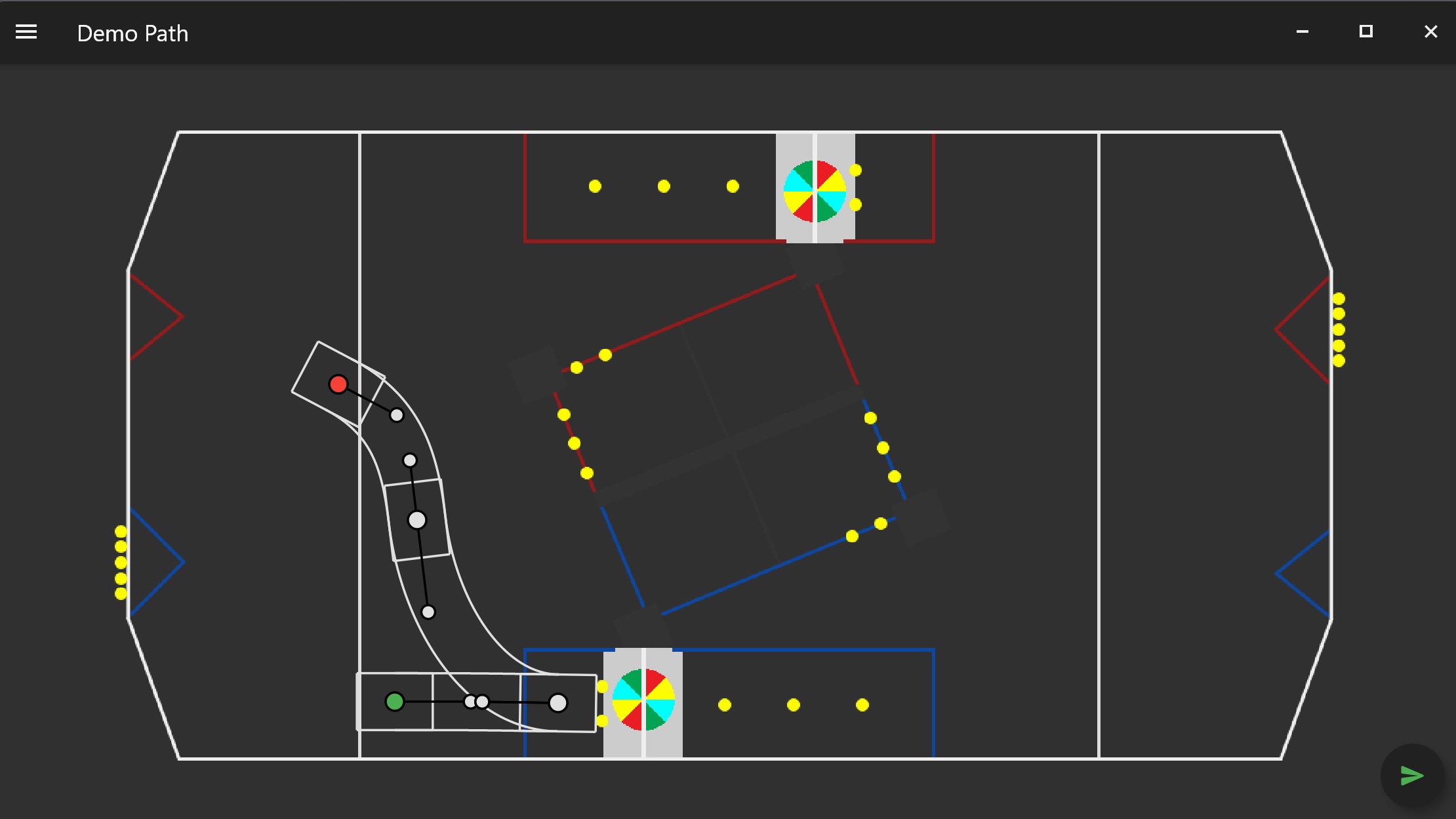 PathPlanner is a motion profile generator for FRC robots created by team 3015. Every path allows for manual tuning of the robot position and the curve radius at every point. It allows you to create the perfect path for your robot quicker and easier than other generators. PathPlanner can handle more complex paths than other generators because it will slow down the robot as it heads into a turn instead of going through it as fast as possible. If the robot is still not slowing down enough or you would like the robot to go slow at a certain point in the path, the robot's max velocity can be overridden at each point. Paths are generated in robot code with and easy to use vendor library, PathPlannerLib.