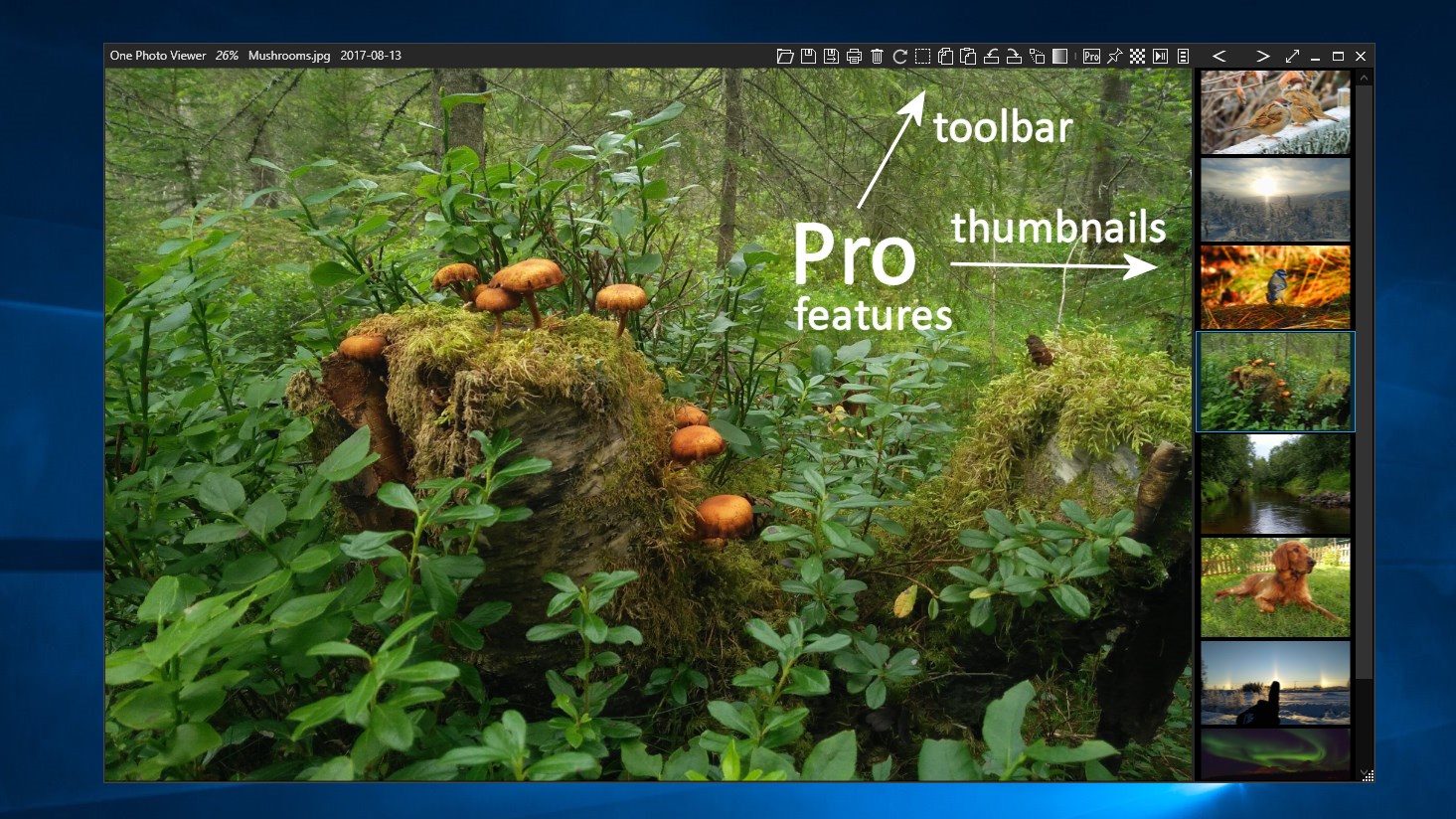 One Photo Viewer is easy to use and has a clean interface. Designed to be used as Windows 10/11 default photo viewer app. Pro version includes two extra optional features, toolbar and thumbnails, otherwise it's the same as the free version. Try out that one fist if you're unsure, get Pro to support development. One Photo Viewer has many customization options and features such as slideshow, color adjustment, crop, resize, rotate, copy/paste clipboard, and more. All accessible by right click menu, keyboard shortcuts or toolbar. It is also touchscreen compatible.