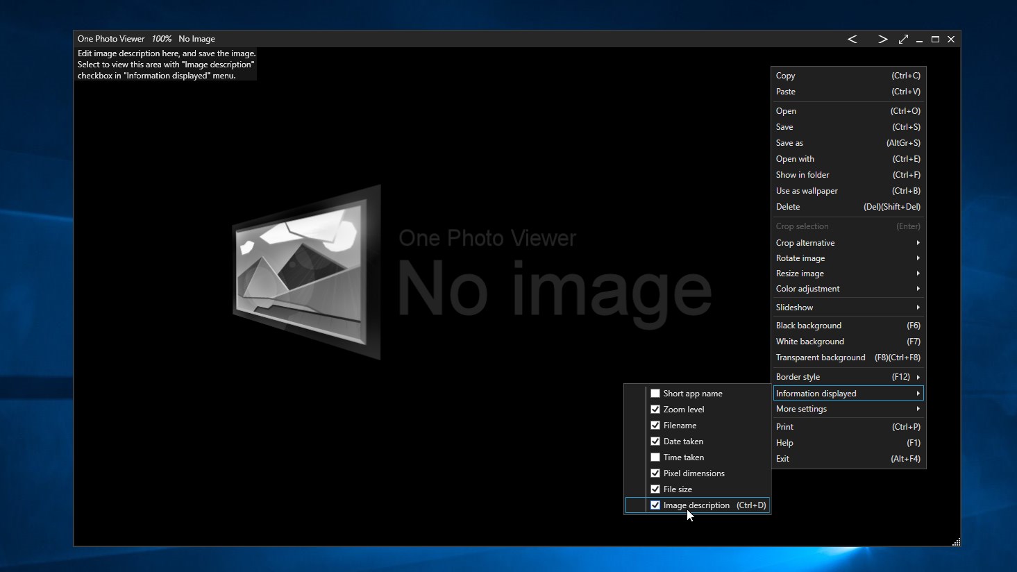 Simple to use and customizable photo viewer for Windows 10/11Scroll through images with arrow keys or mouse buttonsSelect window border style Solid, Minimal or Auto hideSwitch between black, white or transparent backgroundOption to move and zoom entire window with mouse/touchStart a slideshow of images in a folder or drag-and-droped filesPaste images from printscreen or other softwareOption to view toolbar and thumbnail panelCrop, rotate, resize, adjust colors -> save or copy to clipboardView RAW formats, HEIC, WEBP (not guaranteed, info on website)View and convert to JPEG, PNG, TIFF or BMPMake GIF animation from loaded filesTouchscreen compatible