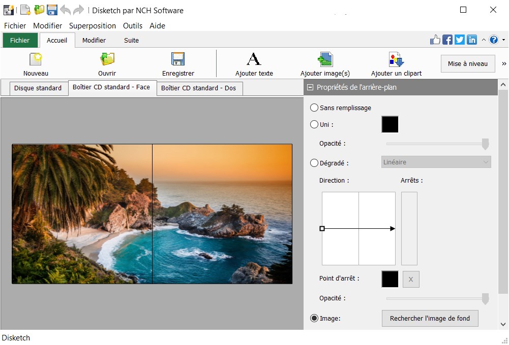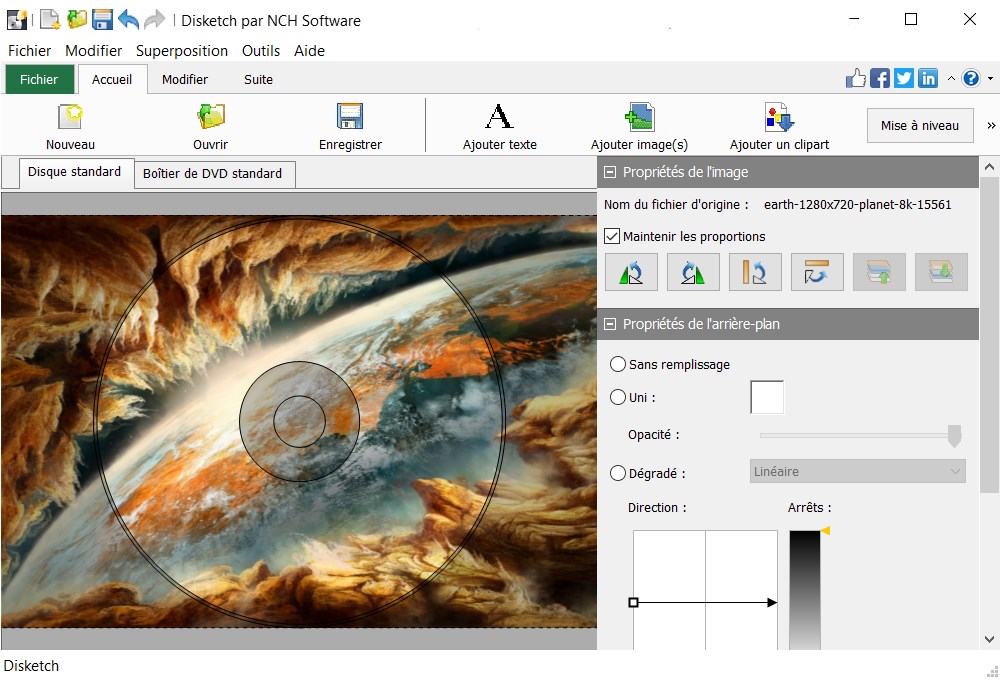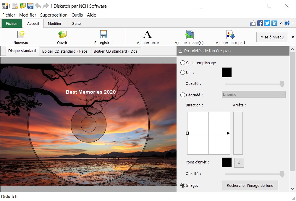 Créez et imprimez vos propres étiquettes de CD et DVD avec Disketch, un créateur d'étiquettes de disques. Créez des étiquettes professionnelles en utilisant vos propres photos, art numérique et texte. Ajoutez des images pour créer des couvertures de DVD ou de CD. Si votre imprimante le prend en charge, vous pouvez également imprimer directement sur un disque. Commencez à étiqueter vos disques maintenant.