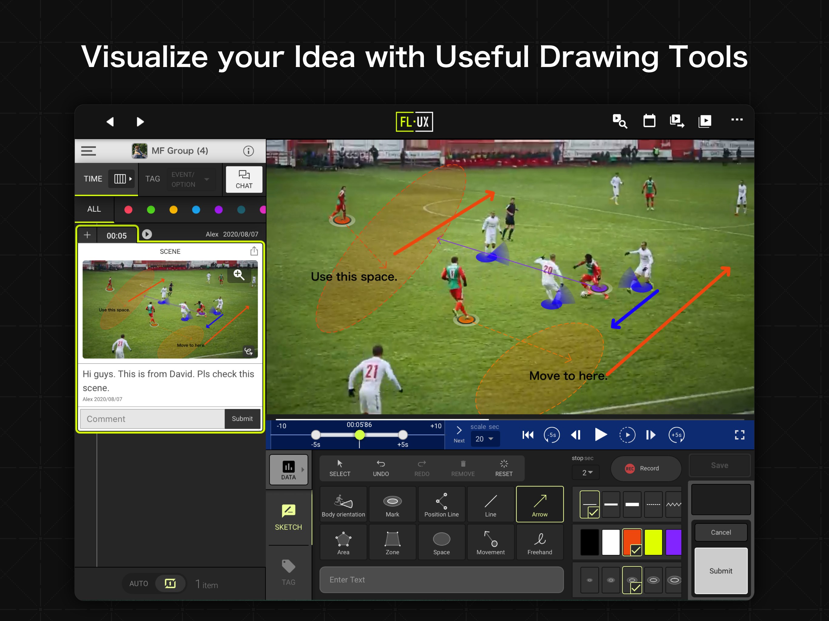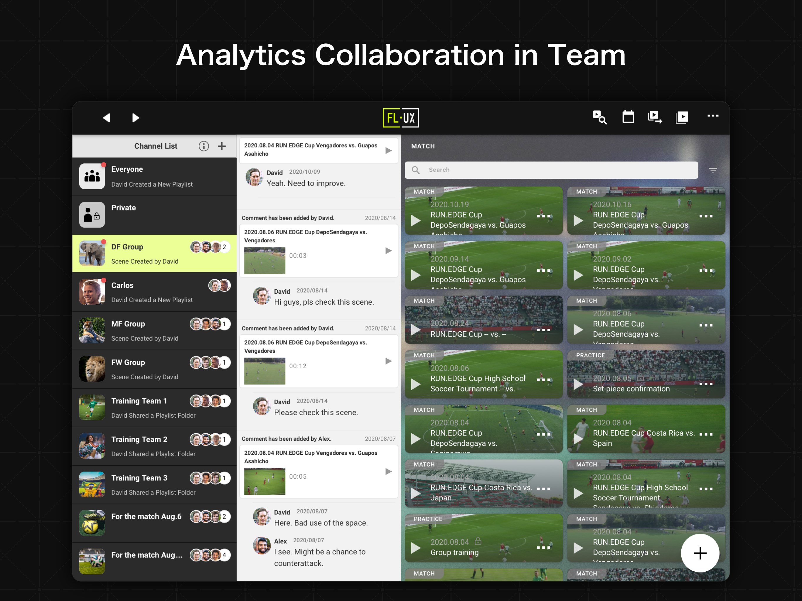 Share video clips with your comments and annotations, making it easy to exchange ideas with team members. FL-UX is ideal for both game analysis and team collaboration.